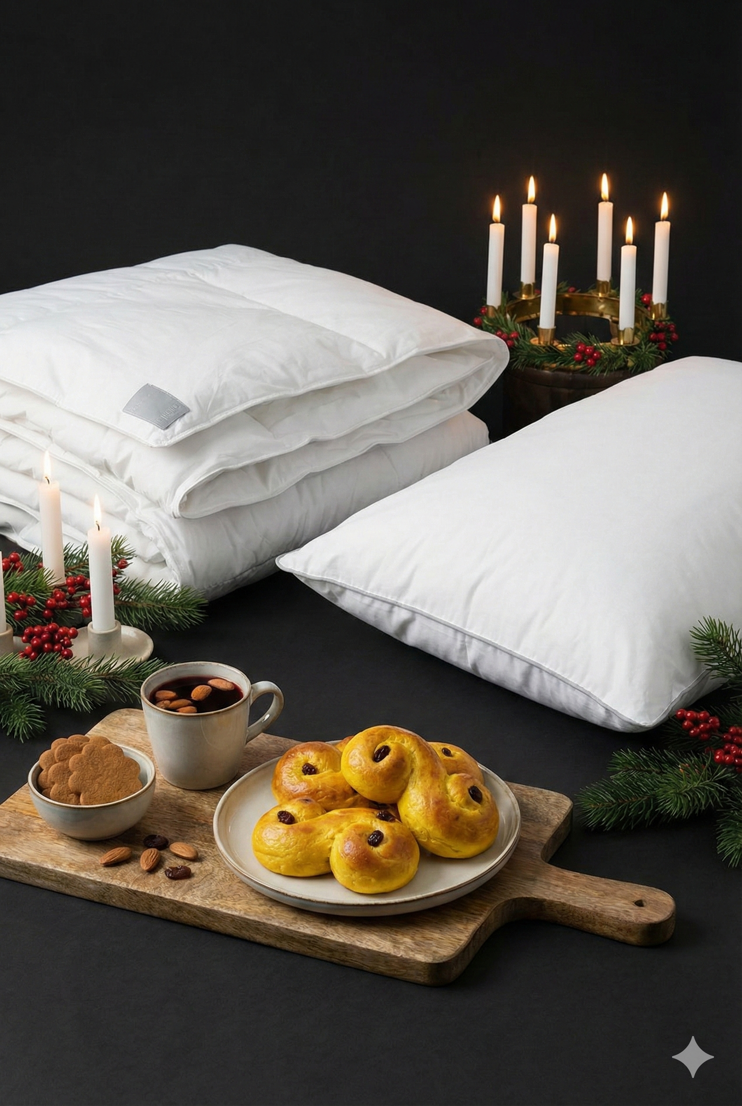 Vi bjuder på lussekatter från Sannas bakverk och erbjuder dessutom 20% rabatt på vår hotellserie av kuddar och täcken.