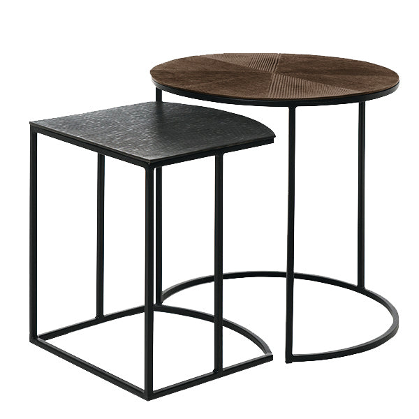 Set of 2 coffee tables with a minimalist style. The tables are made with aluminum tops. The different design of each table is characterized by the fact that the legs are made of iron.