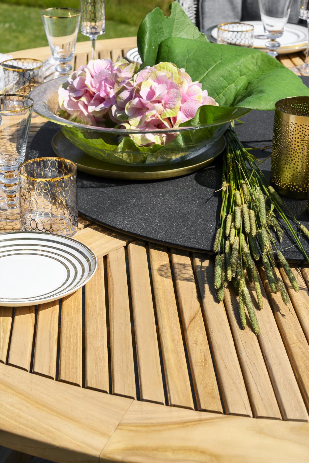 Circus are rustic teak tables in various sizes. The table with a diameter of 180 cm is delivered complete with a glass serving tray with superstone (including swivel fittings). Tables with a diameter of 130 and 150 cm cannot be supplemented with a serving tray.