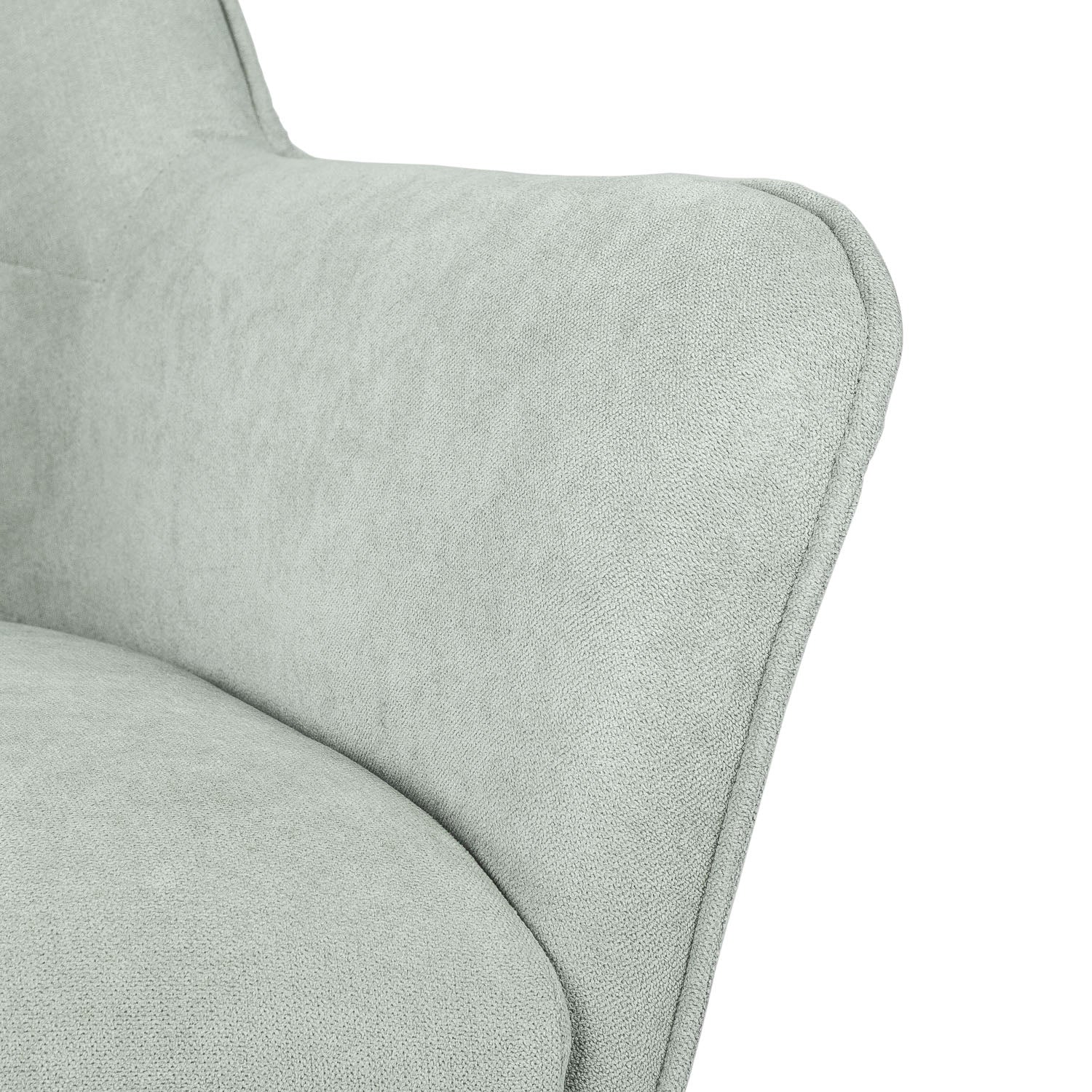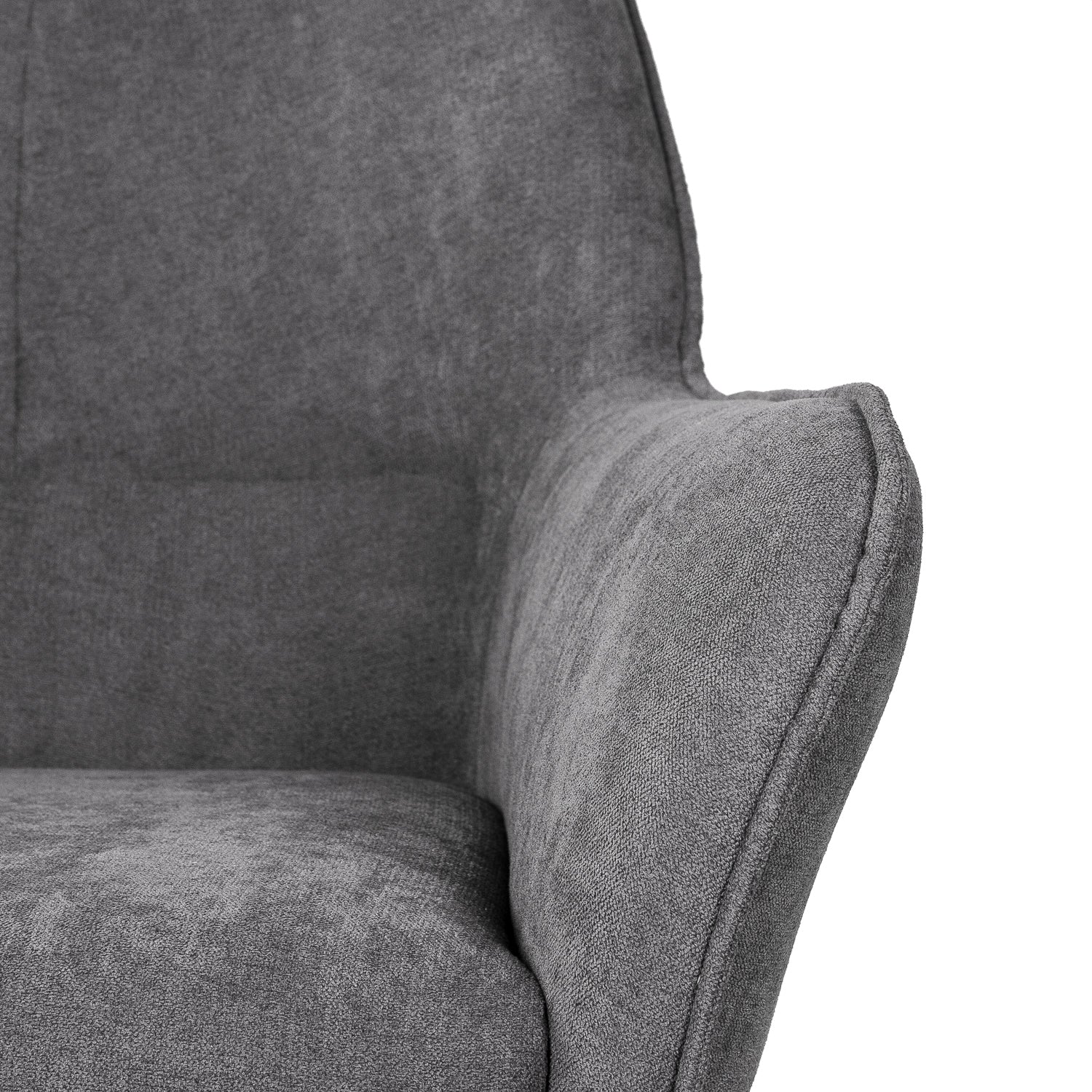 Rocking chair upholstered in light gray with a black steel structure and a wooden sled with a natural finish.