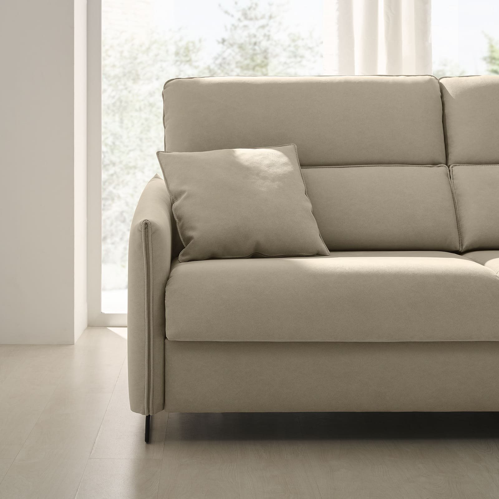 Gold är en bäddsoffa som verkligen lyfter rummet. Den har en stabil stomme av furu och en smidig italiensk mekanism i stål som gör den enkel att fälla ut. Sittkuddarna är fyllda med rejält skum som håller formen bra.