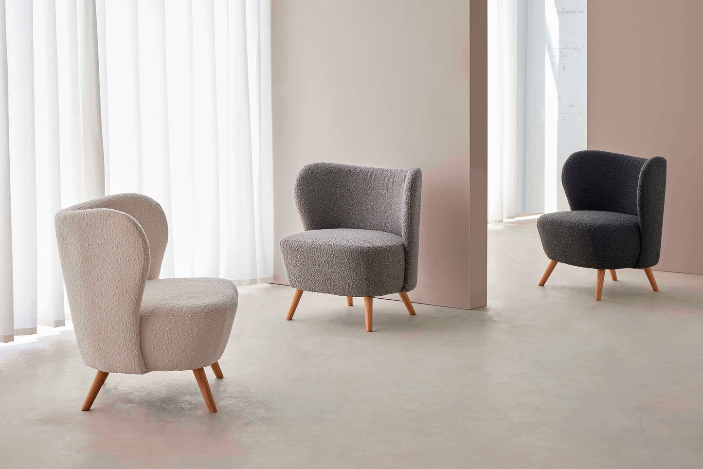 Armchair upholstered in white sheepskin-effect fabric and with wooden legs