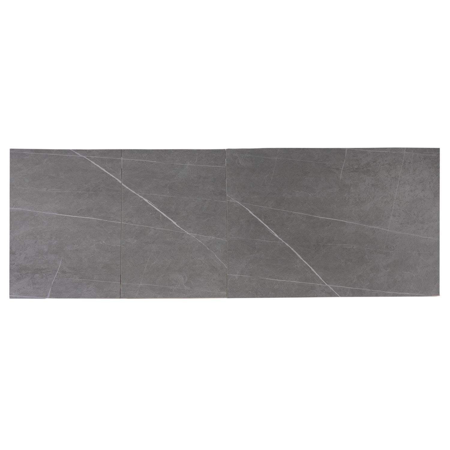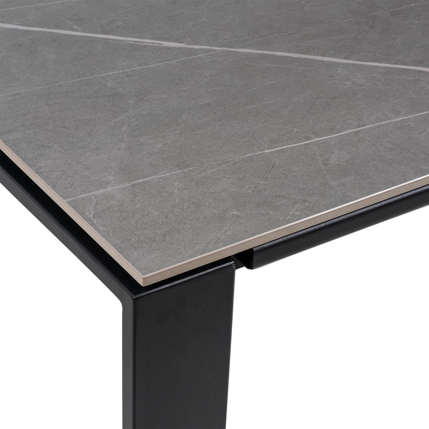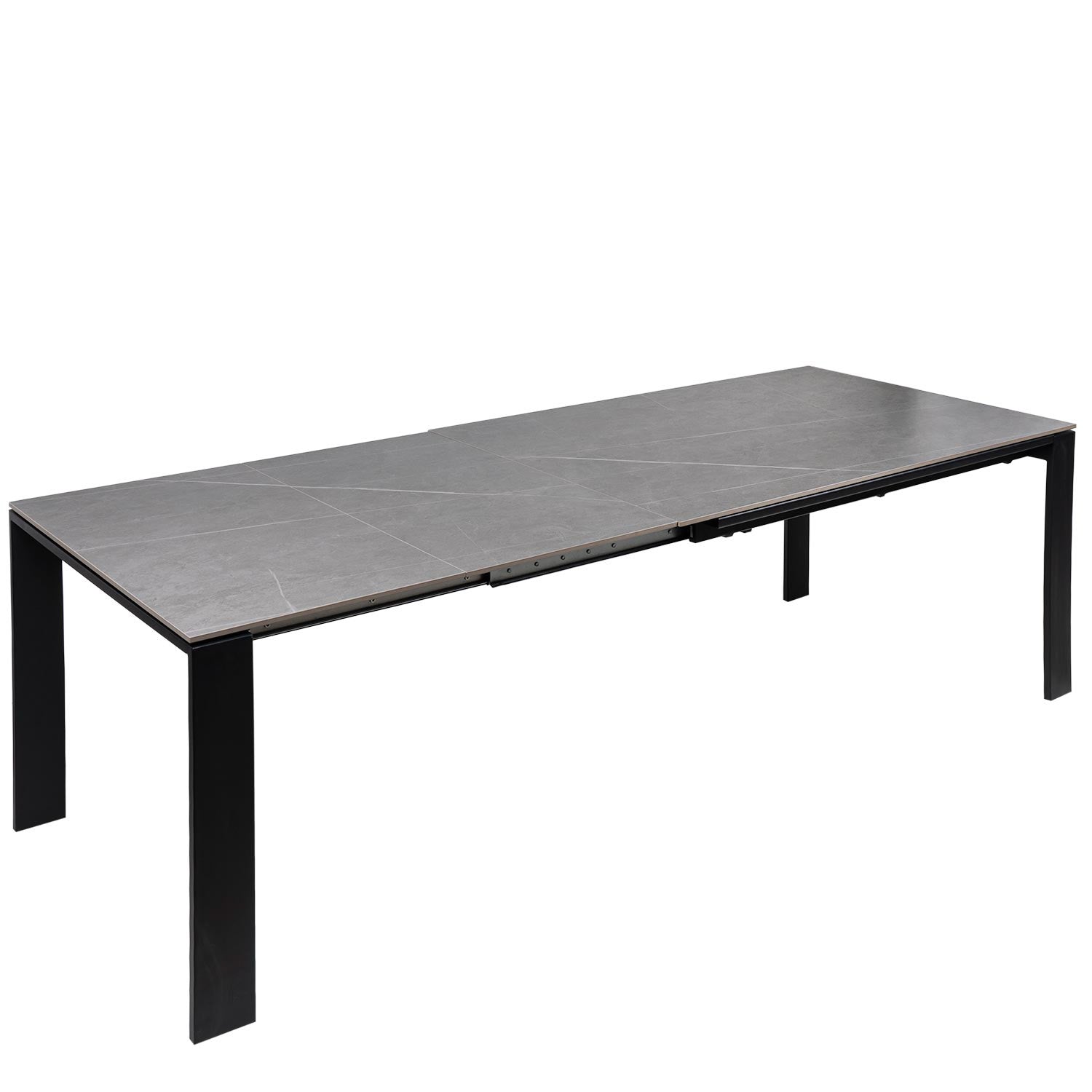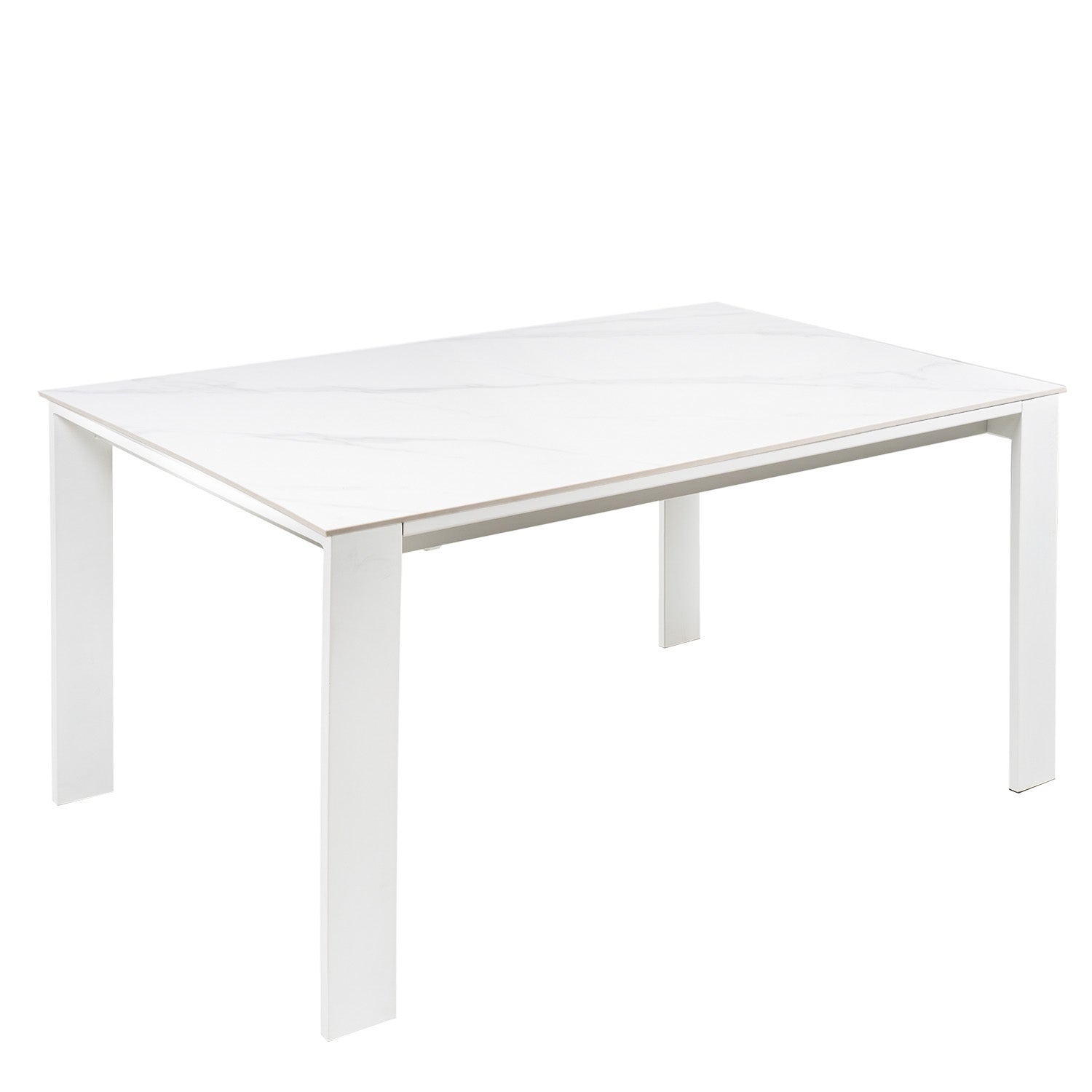 Extendable table with 10mm solid porcelain top in various colors and metal legs in white or black.