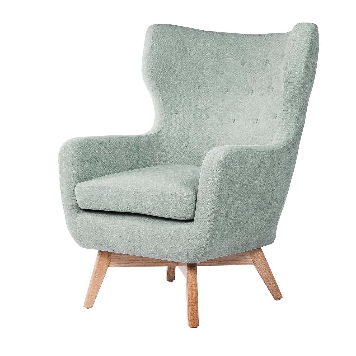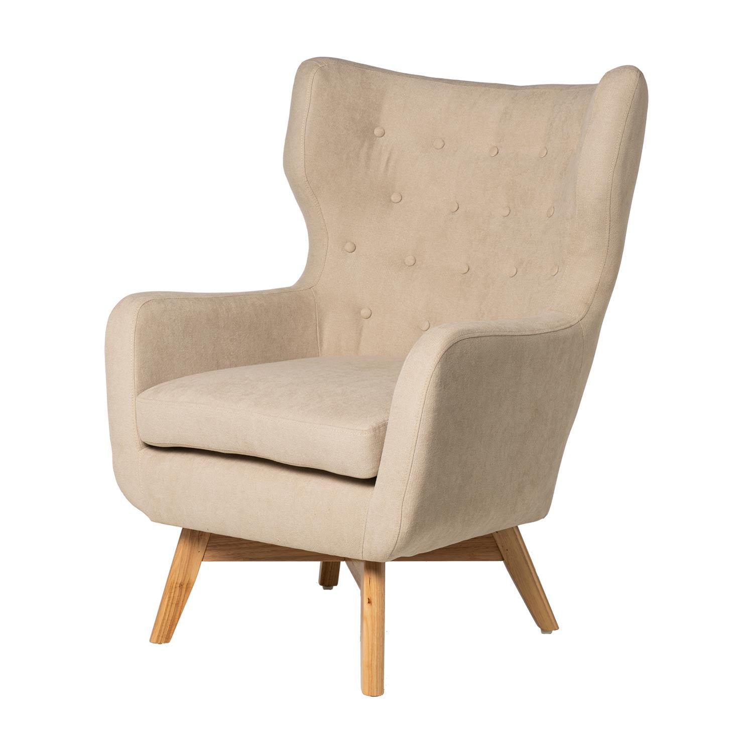Lisboa armchair upholstered in light gray with slightly inclined wooden legs in natural color.