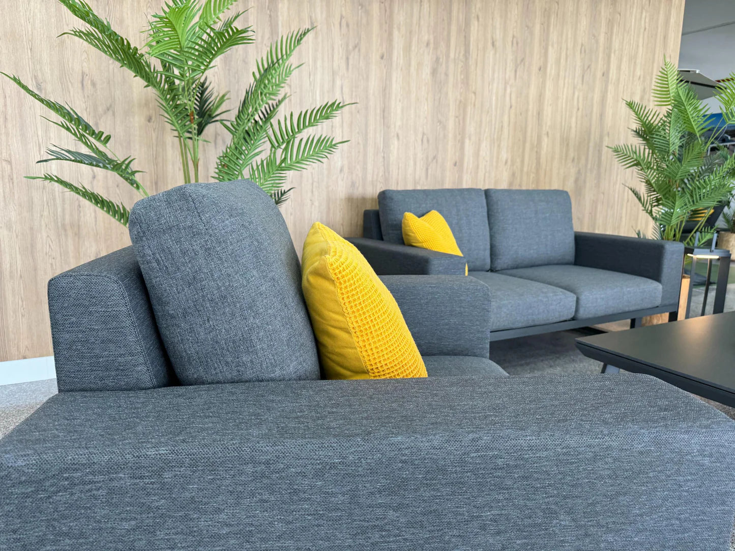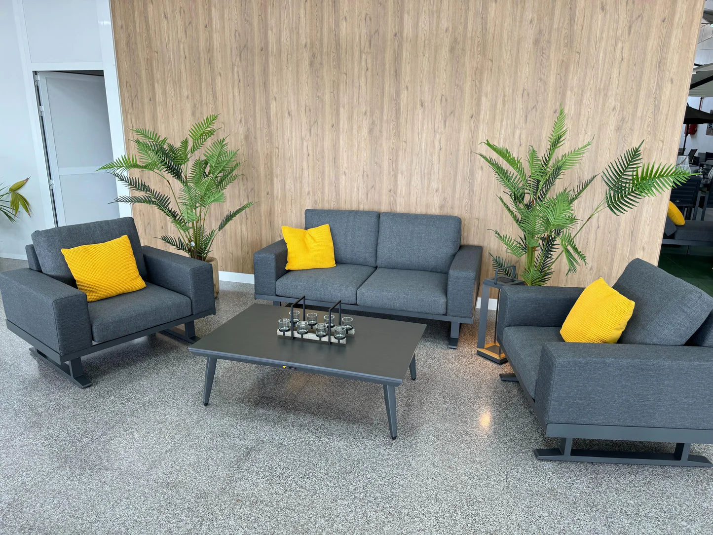 Introducing the Monaco 2-seater sofa set - a blend of sophistication and durability. perfect for relaxing outdoors. With its robust aluminum frame. thick arms and deep cushions, comfort is paramount. The texelin wrapped arms not only add a modern touch but also ensure resistance to wear and tear. Relaxation is guaranteed with the high back that provides plenty of support. Whether it's a lazy afternoon with a book or a gathering of friends. this set promises luxury and comfort. To protect against weather and wind, a weather cover is included, which extends the life of the set. Elevate your outdoor space with the Monaco 2-seater sofa set.