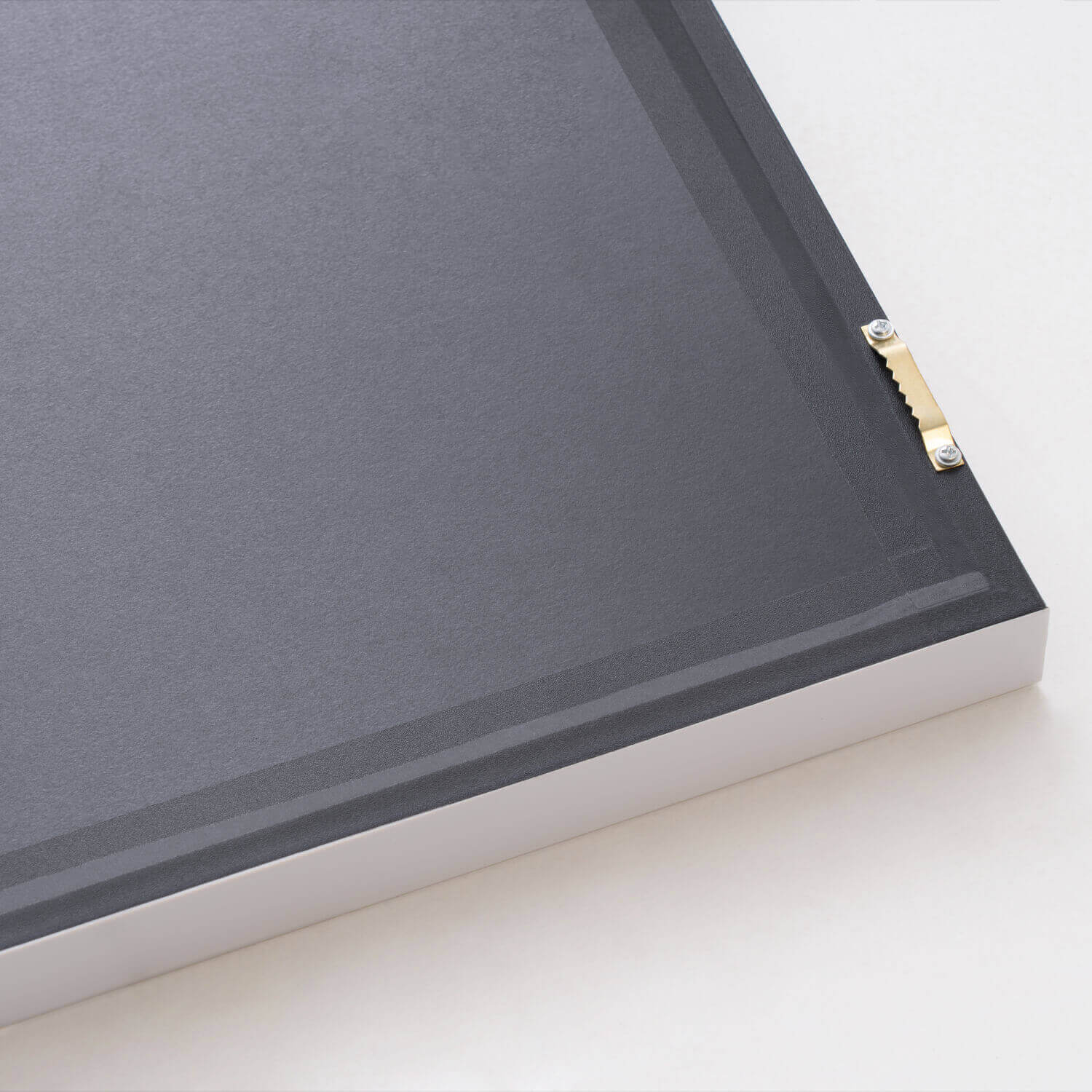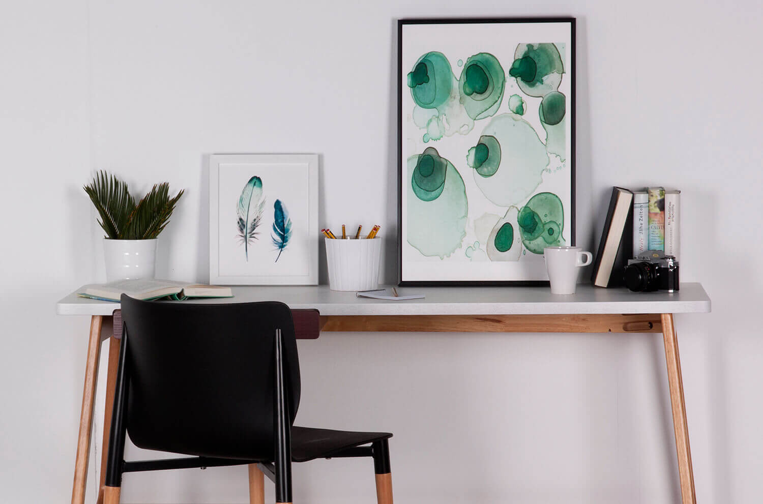 The soft colors, which highlight the blue ones, evoke a feeling of calm and depth thanks to the black brushstrokes that compose it.