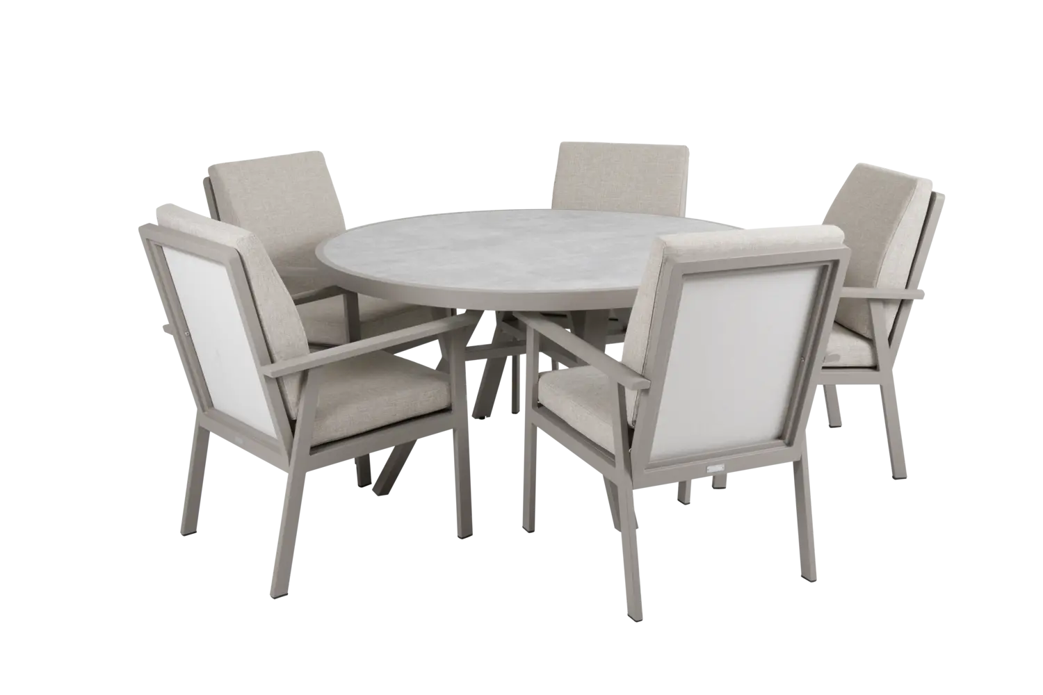 With this dining table, meals can really move outside. There is plenty of space here to socialize, five armchairs from Samvaro fit perfectly. The round shape is cozy, which together with the 3D-printed glass top creates a nice feeling.