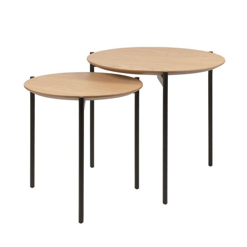 Set of two tables in oak veneer with black metal legs.