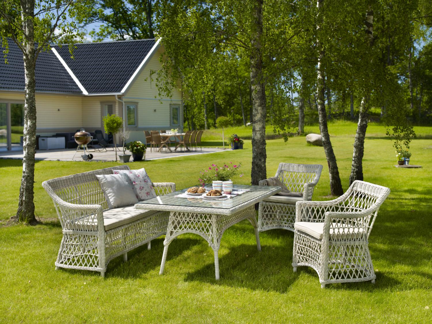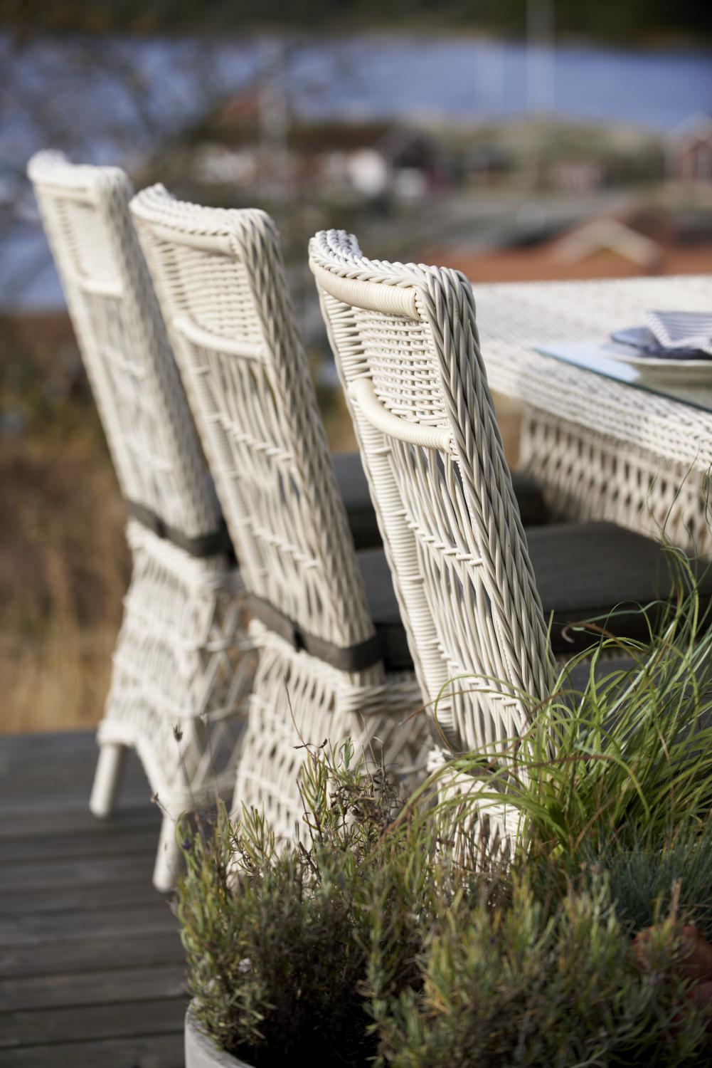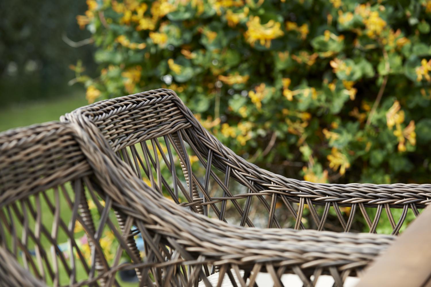 Beatrice tiene claras y características influencias del pasado, con mimbre sintético de 5,3 mm escasamente trenzado sobre un marco de aluminio. Edredón incluido.
