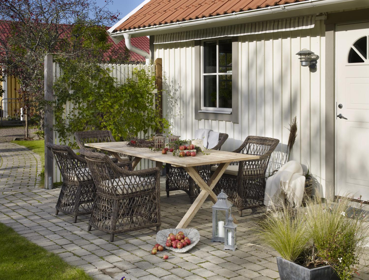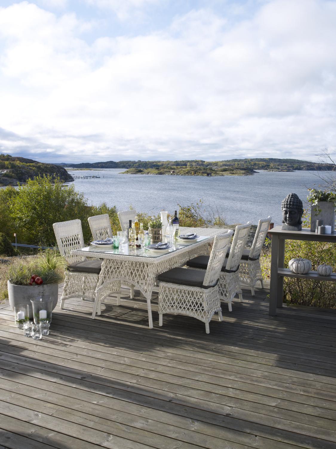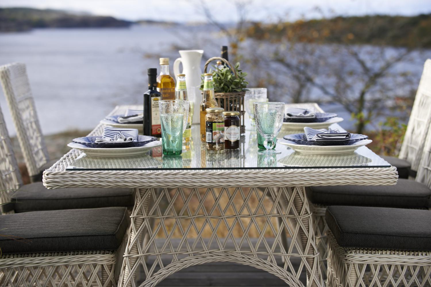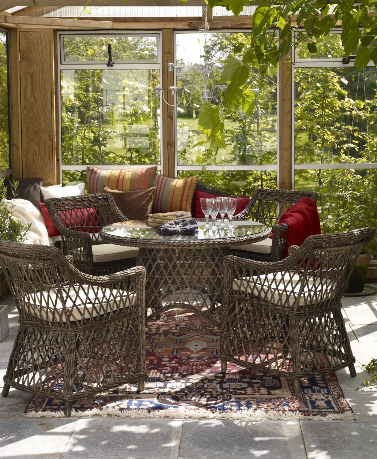 Beatrice tiene claras y características influencias del pasado, con mimbre sintético de 5,3 mm escasamente trenzado sobre un marco de aluminio. Edredón incluido.