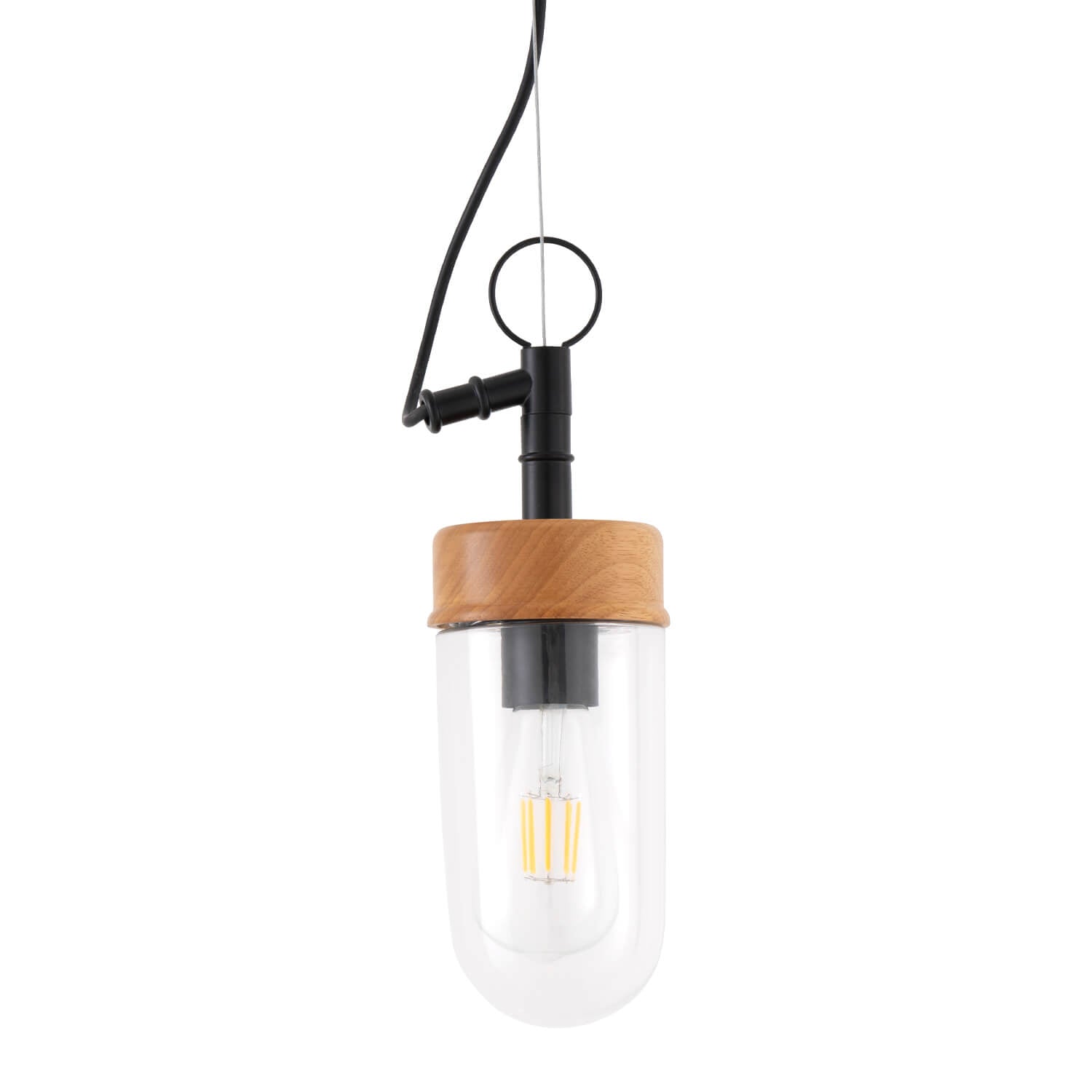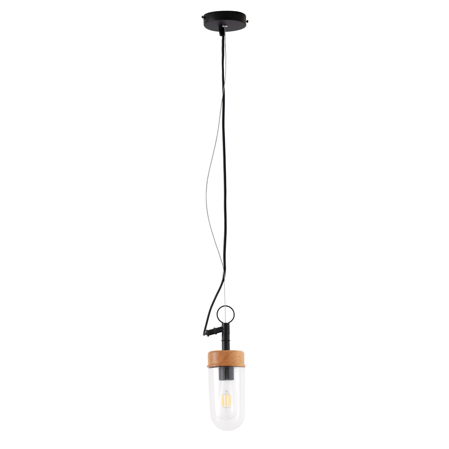 Lámpara de techo de diseño nórdico que combina cristal con madera y metal negro. La combinación de materiales y su diseño lo hacen perfecto para ambientes nórdicos.