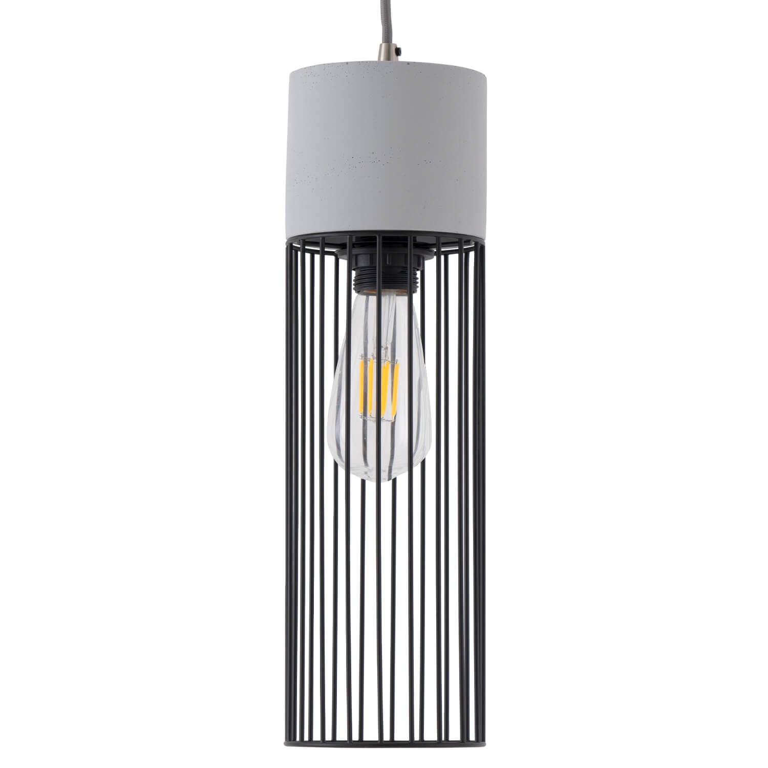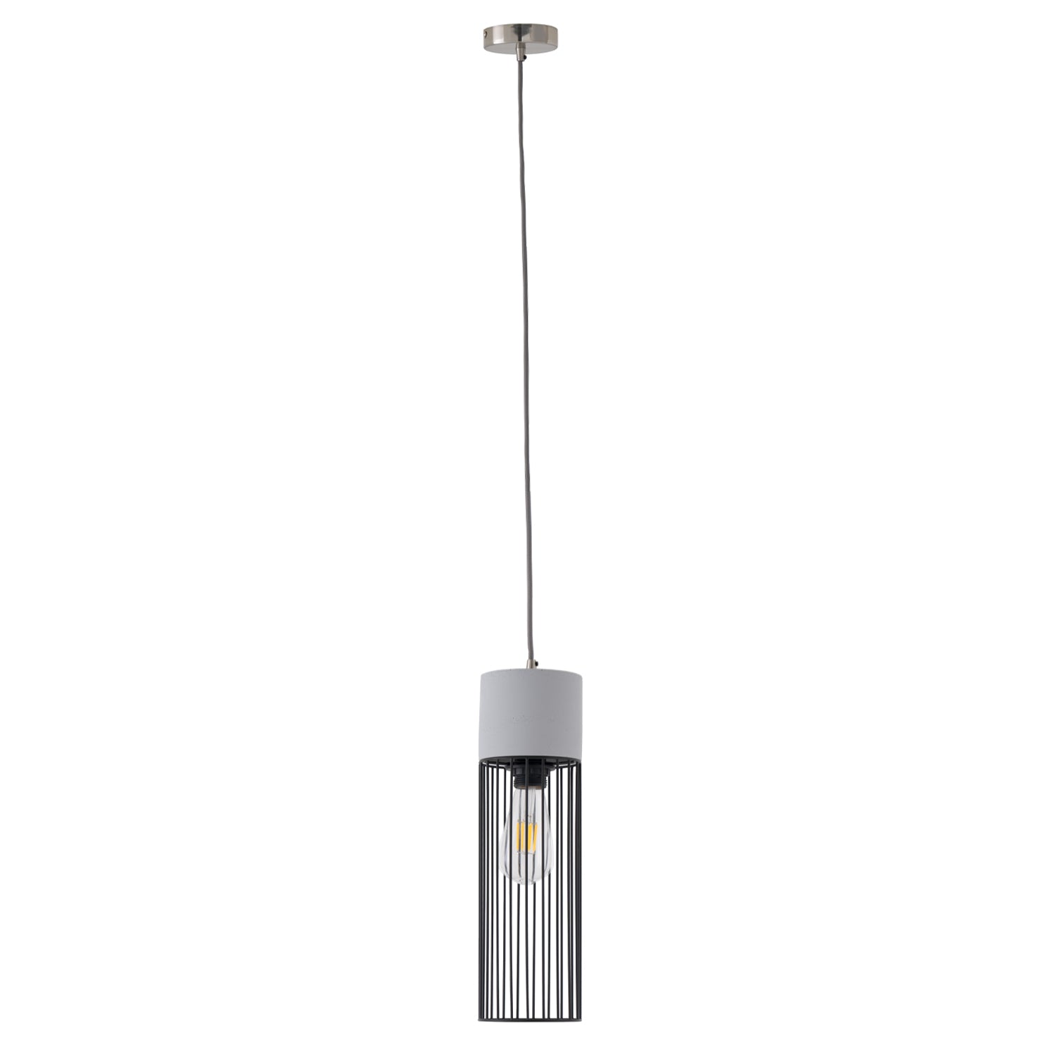 La pantalla de cemento le da un aspecto sólido y moderno, mientras que la jaula de metal negro le da un toque de sofisticación.