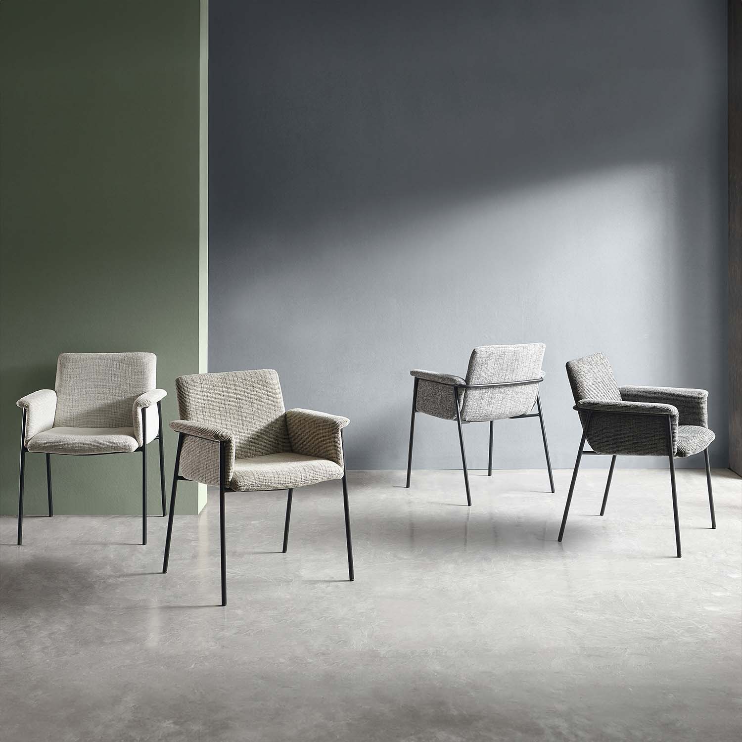 La silla CAROLYN tiene un diseño moderno y minimalista en el que resalta el amplio asiento y respaldo, completamente tapizado en tela acolchada color gris claro que garantiza comodidad y fácil mantenimiento.