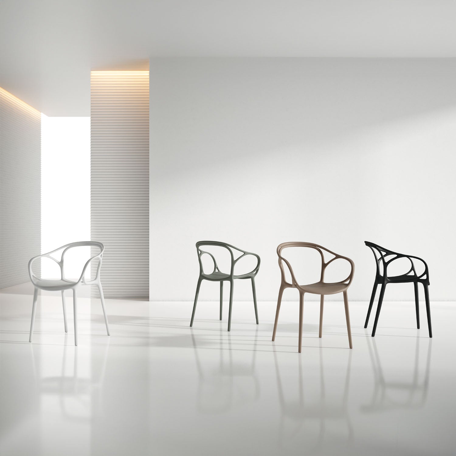 La silla EILIN combina a la perfección líneas curvas y fluidas, con una estructura de una sola pieza que le confiere un aspecto sólido y sofisticado.