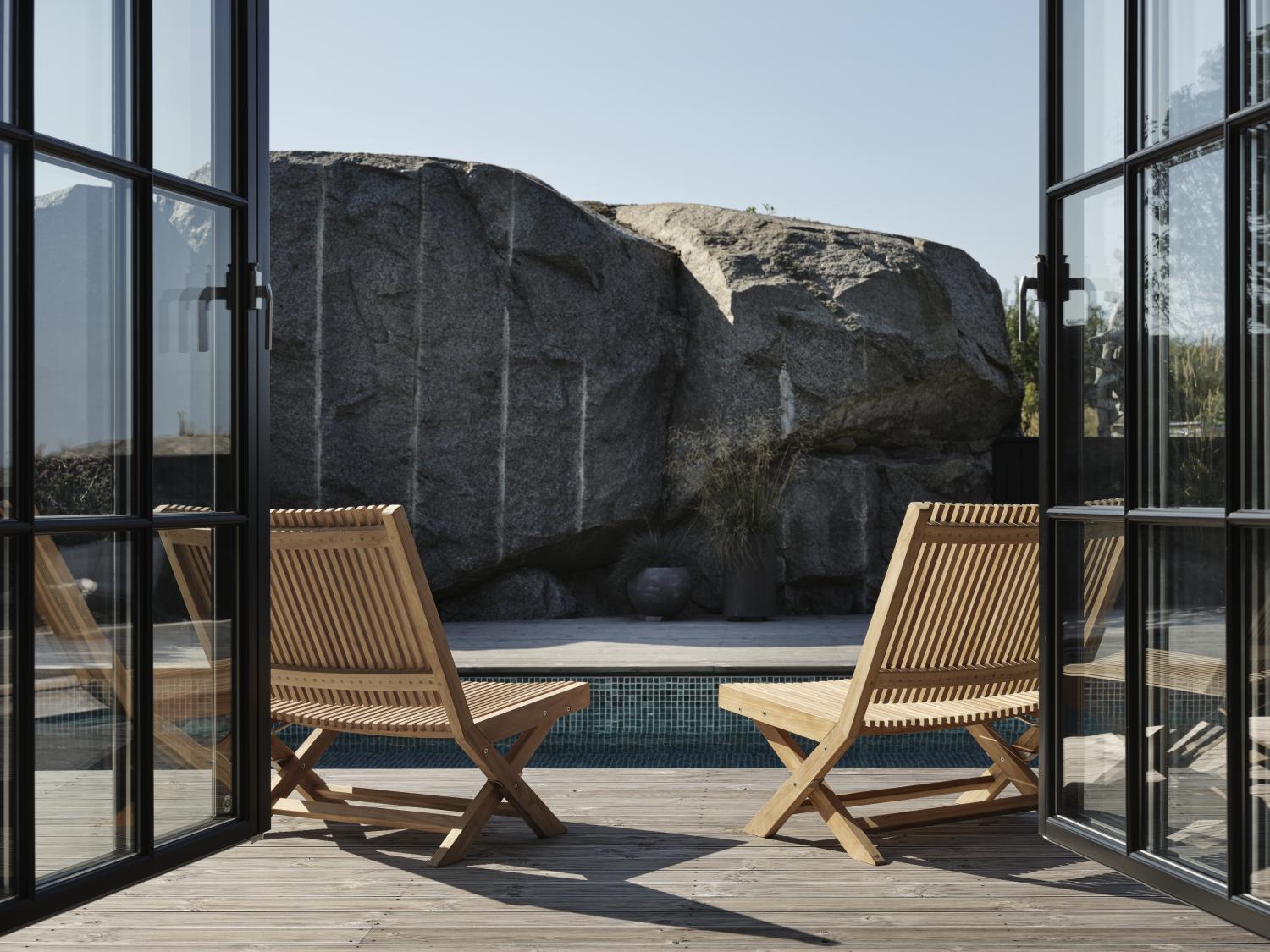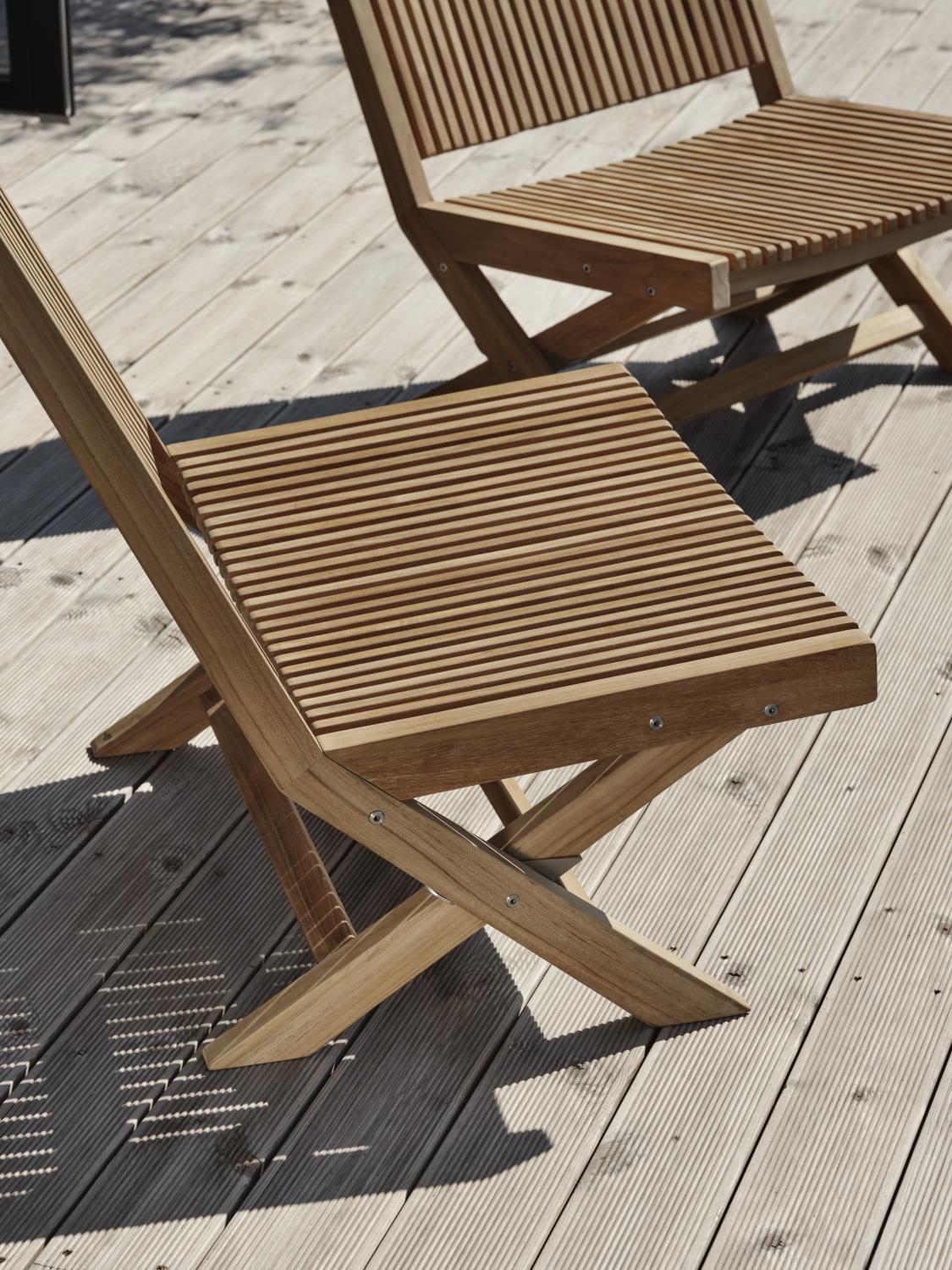 Un hermoso grupo premium con barras transversales de teca como característica continua: Julita toma las líneas rectas del diseño escandinavo y crea un área de comedor cómoda que se destaca por su estilo mientras se mezcla con su entorno.