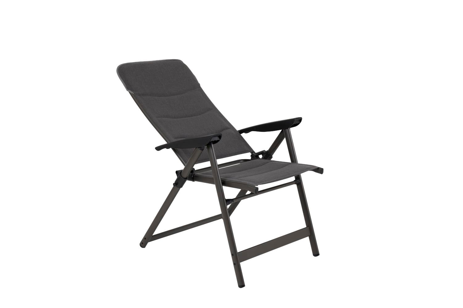 Sillón reclinable plegable fabricado en aluminio pintado en polvo con fibras de olefina en el asiento.