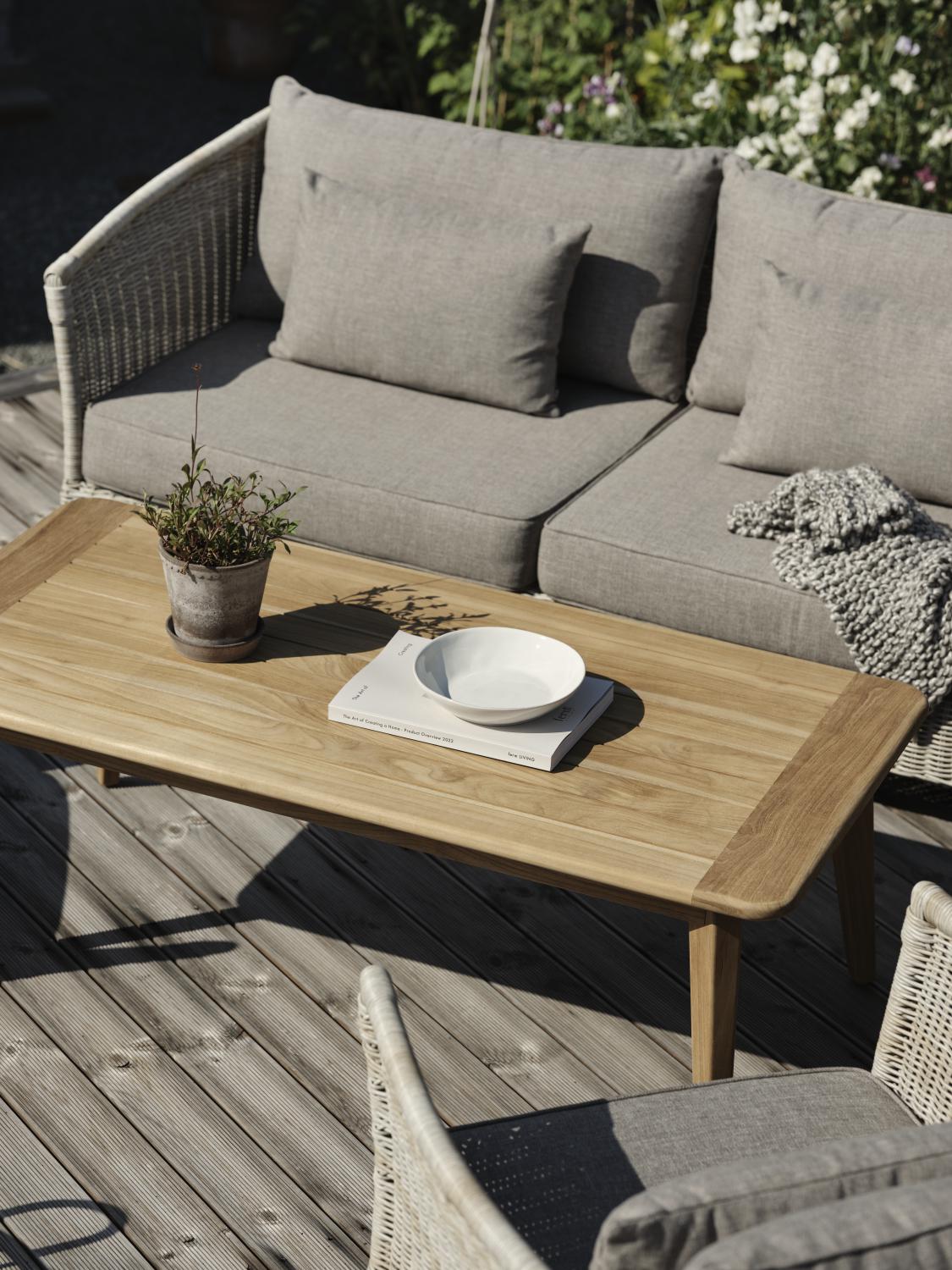 Lilja es un grupo hecho para adaptarse tanto a la relajación como a las comidas. Formas orgánicas redondas en teca. Piezas sólidas que al mismo tiempo tienen una elegancia en sus detalles redondeados.