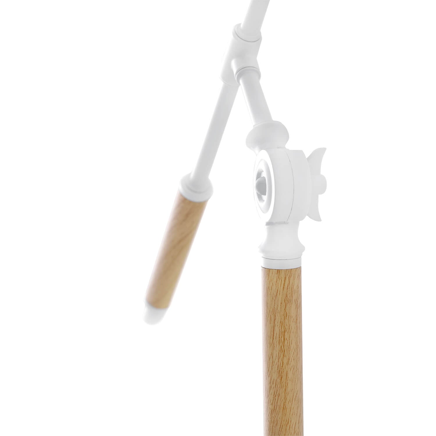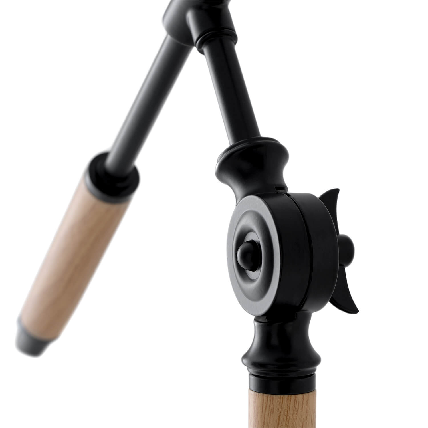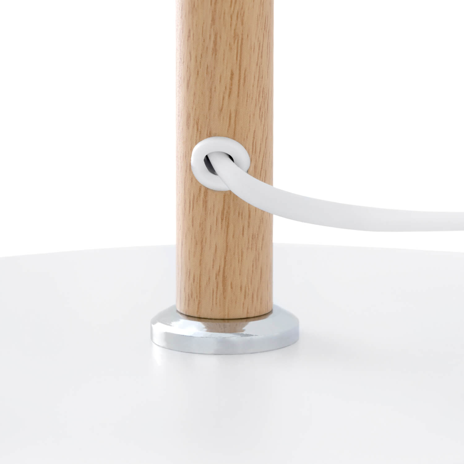 Lámpara de mesa de metal, madera y pantalla de tela.