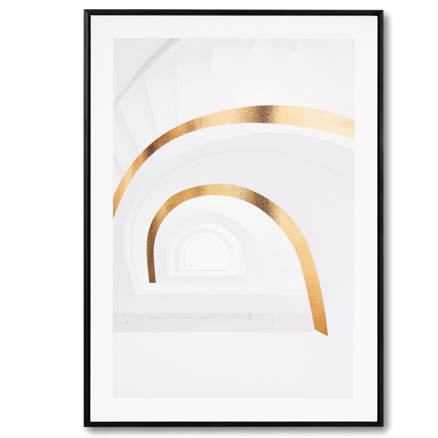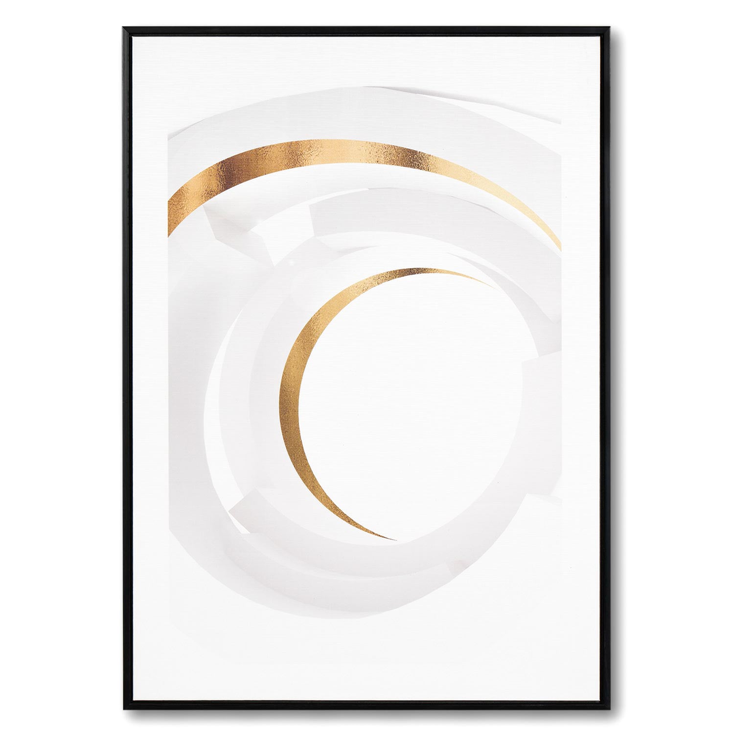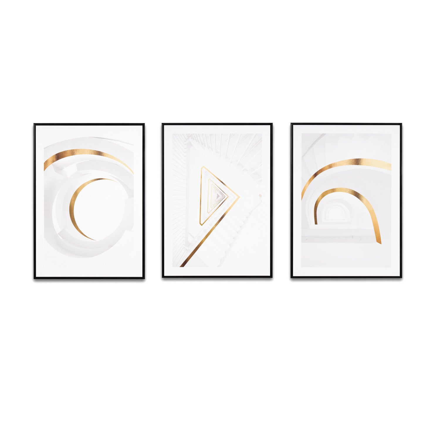 La composición de formas geométricas en una estética minimalista y los tonos dorados y blancos crean una sensación de profundidad y sofisticación.
