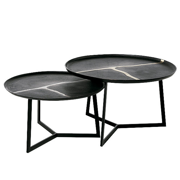Este conjunto de dos mesas está fabricado en metal de alta calidad con un sofisticado acabado texturizado que imita un diseño marmolado. Las sutiles líneas blancas sobre fondo negro aportan un toque artístico y refinado, convirtiendo estas mesas en un elemento decorativo que trasciende su funcionalidad.