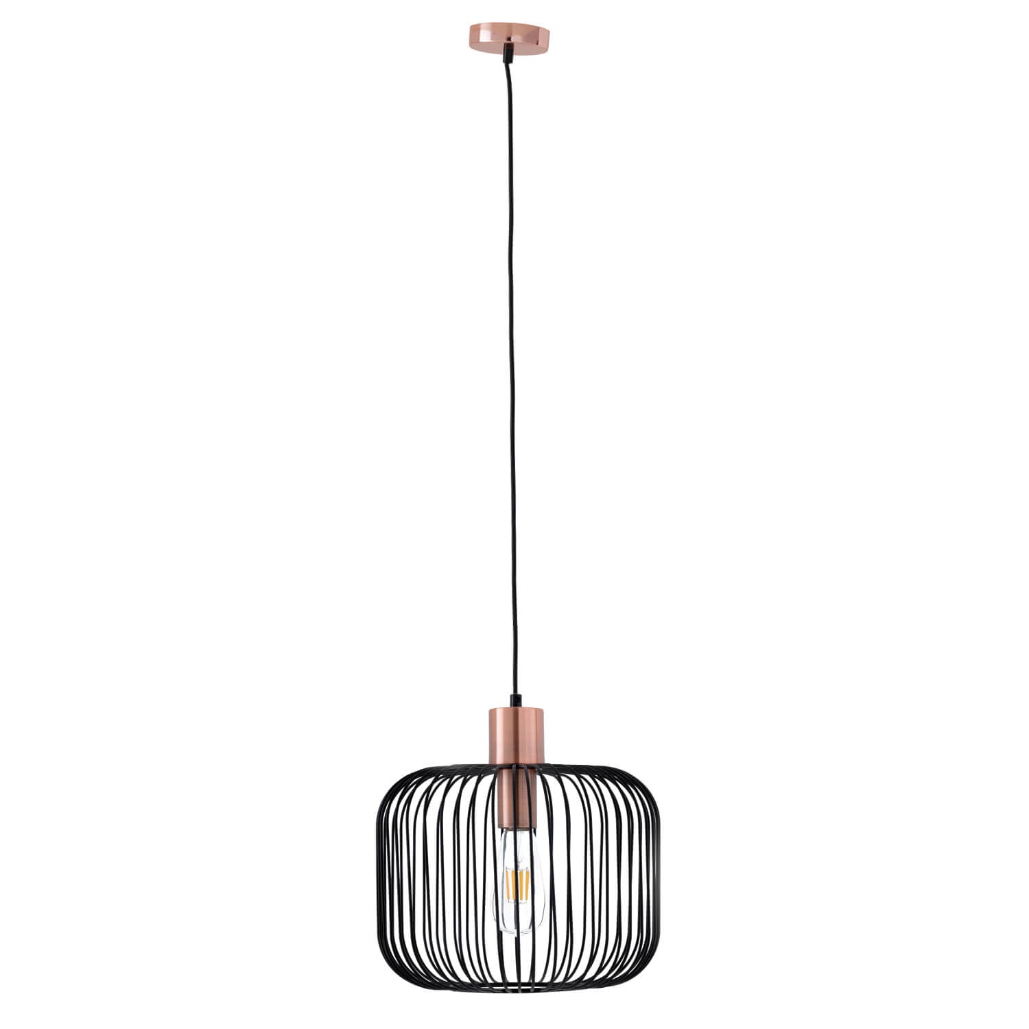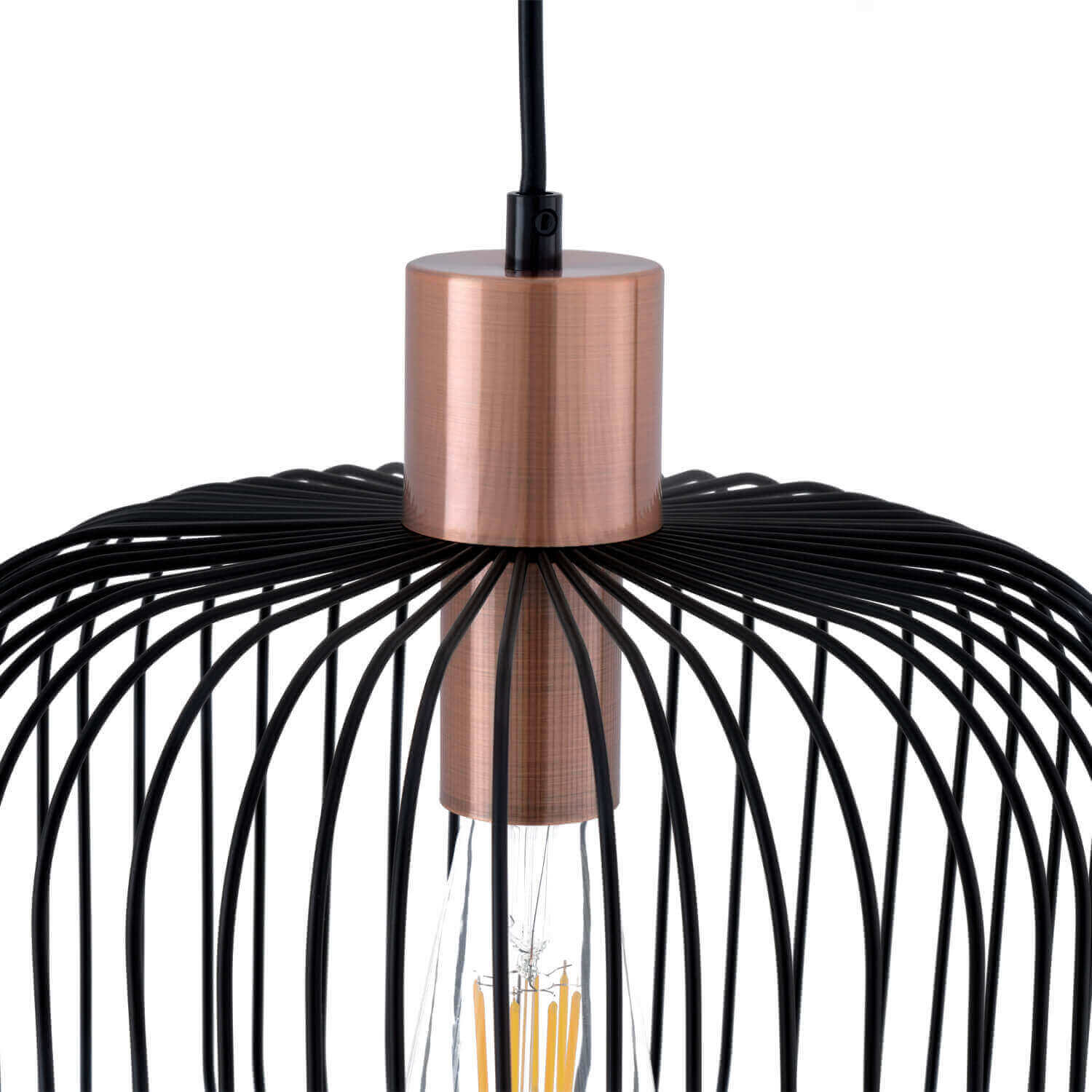 Elegante lámpara de techo realizada en fino metal de color negro y rematada en un elegante soporte de metal color cobre-dorado.