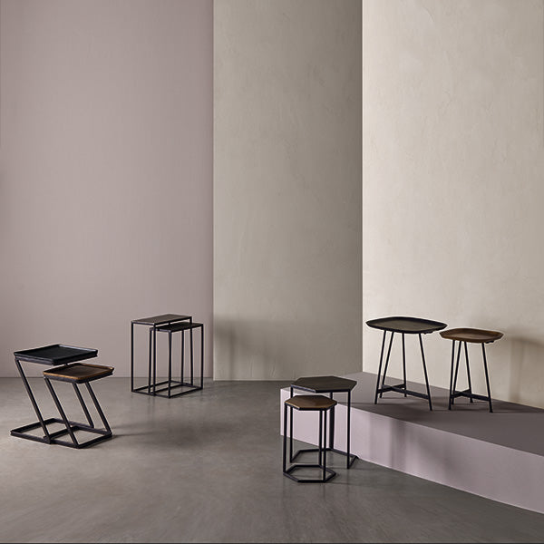 El conjunto de mesas auxiliares RUNSHIL destaca por su elegante diseño hexagonal. Las tapas de aluminio tienen un acabado sutilmente texturizado que les da un toque sofisticado y moderno.