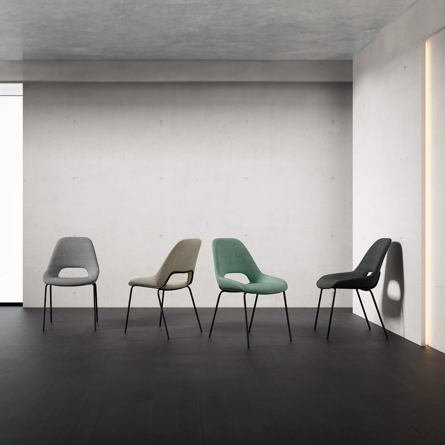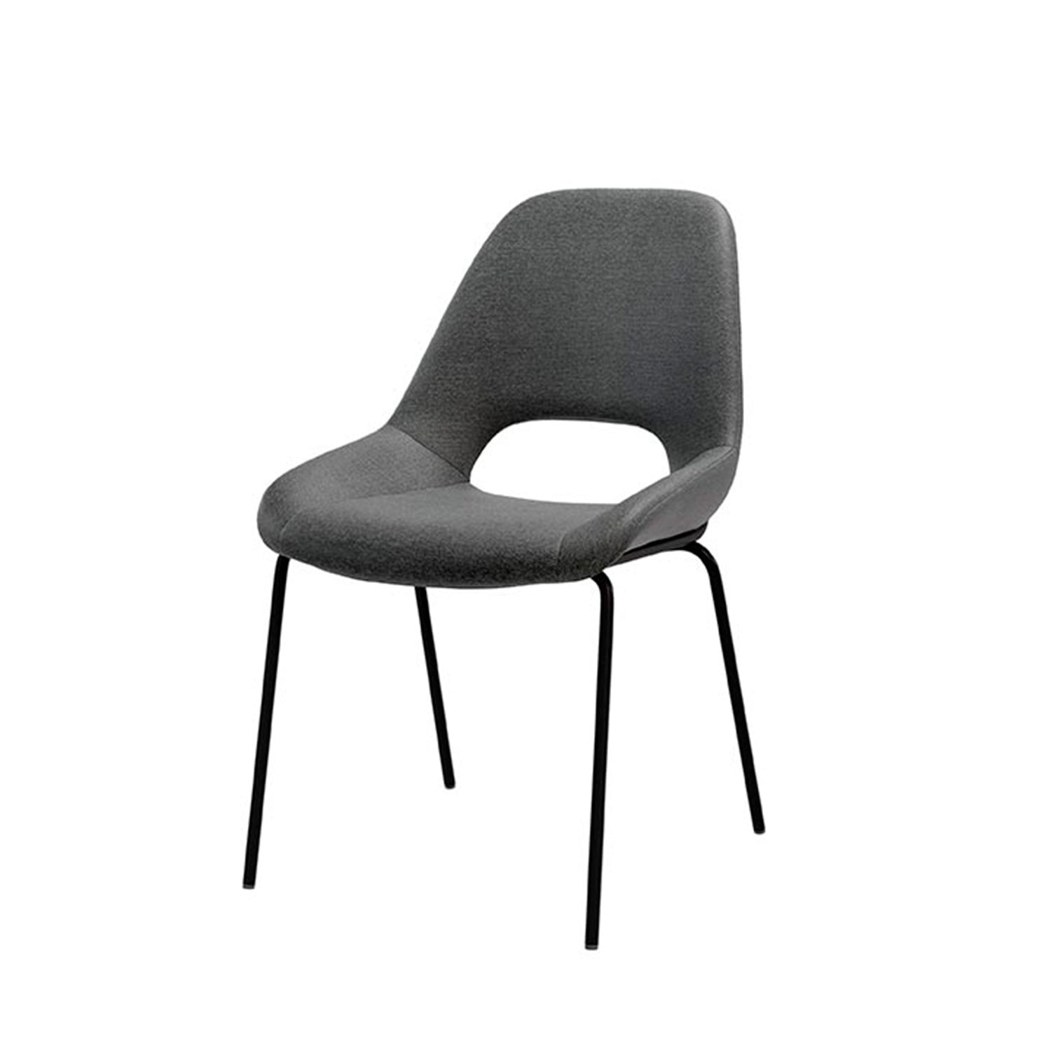 La silla SIMONA se caracteriza por su apertura en el respaldo, elegantemente enmarcado con metal negro que complementa perfectamente la estructura y las patas.