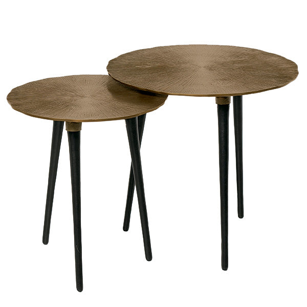 El juego de mesas auxiliares SUJAY eleva el minimalismo con un toque artístico y un acabado cuidadosamente elaborado. Las tapas de aluminio dorado están grabadas para añadir carácter y textura, creando un juego de luces y sombras que realza su atractivo visual.