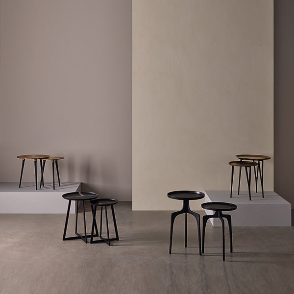 Cada mesa está hecha a mano con pequeñas imperfecciones que le aportan autenticidad y la hacen única. Las patas de hierro, con diseños similares pero diferentes alturas, están diseñadas para encajar unas debajo de otras, lo que facilita su uso versátil y optimiza el espacio disponible.