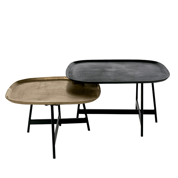 Las mesas están fabricadas en aluminio y hierro y combinan la ligereza de los tableros metálicos con la resistencia de las patas lacadas en negro, creando un contraste visual atractivo y moderno.