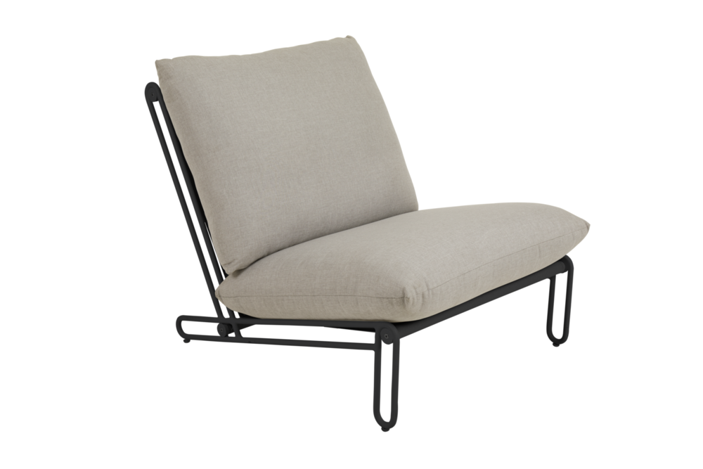 En skön loungefåtölj som sticker ut. Vinklarna och de öppna stommarna i aluminium skapar en klockren plats att koppla av på. Dynorna finns i rosa, grå och beige och är alla klädda i vattenavvisande olefintyg. De här fåtöljerna står bra för sig själva – men tillsammans med Blixt sittdel kan de byggas ut till soffa.