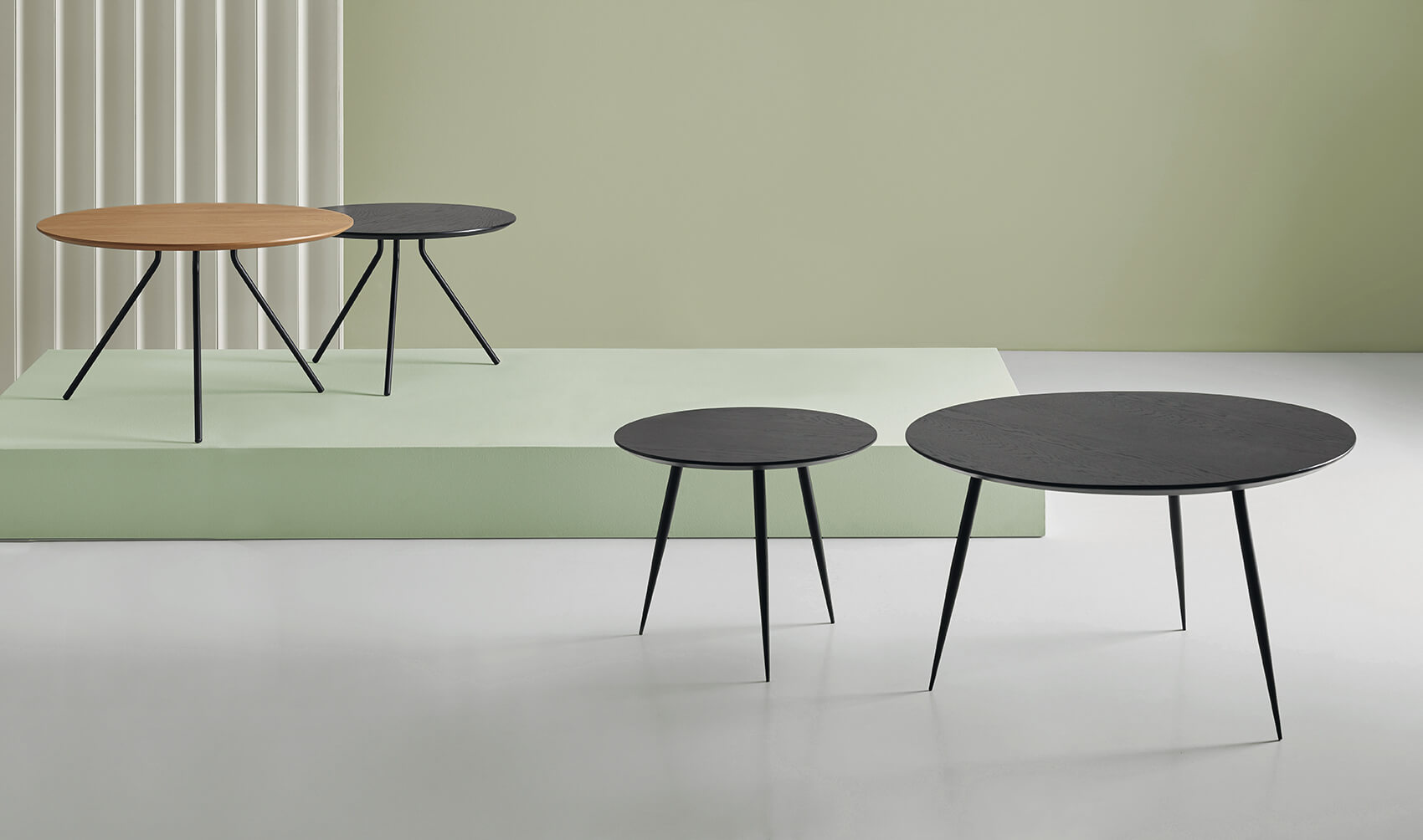 Runt soffbord på ø 60 cm i svartbetsad ekfanér och svarta metallben.
