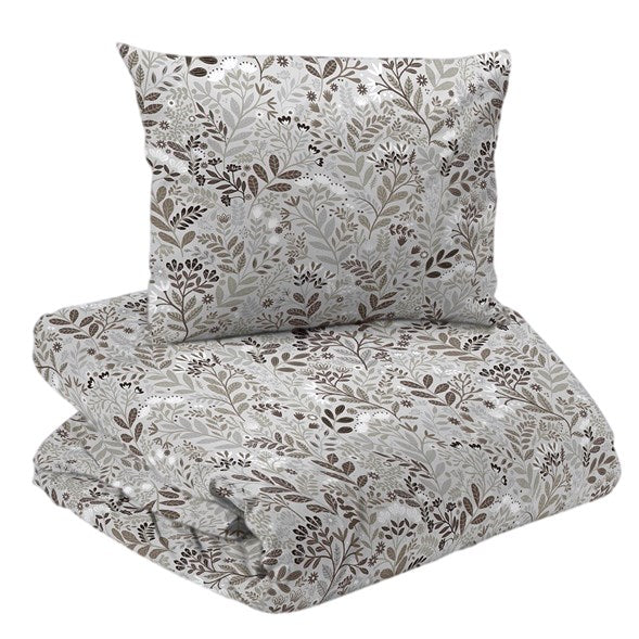 Bäddset med vackert småmönstrat blommotiv i bruna och beige nyanser på brun botten. Mönster skapat av svensk designer.