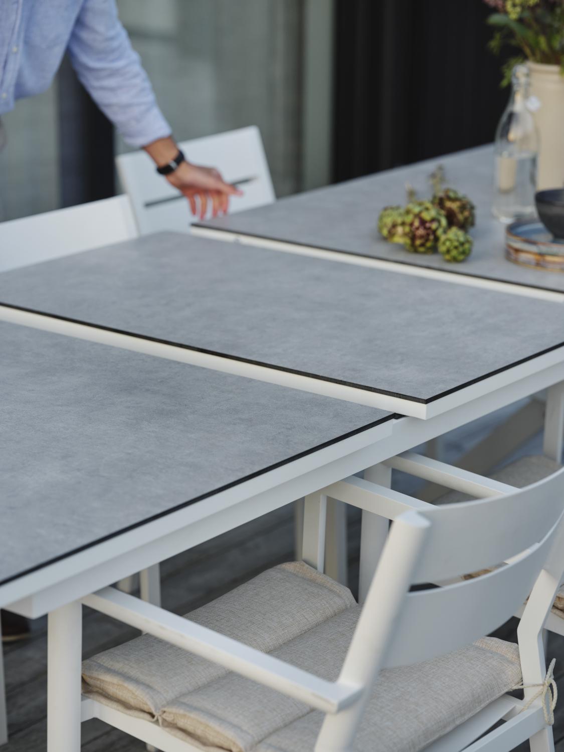 Dags att samla vänner och familj till en riktigt härlig fest? Då är utdragsbordet Hillmond det perfekta valet. Antingen väljer du vårt längsta utdragsbord som har plats för minst 12 personer, eller så väljer du den mindre varianten som 8-10 personer kan samlas runt. Bordet har underrede av lackad aluminium och till bordsskivan kan du välja antingen tvärgående aluminiumribbor med präglat trämönster eller någon av våra trämönstrade laminatskivor.