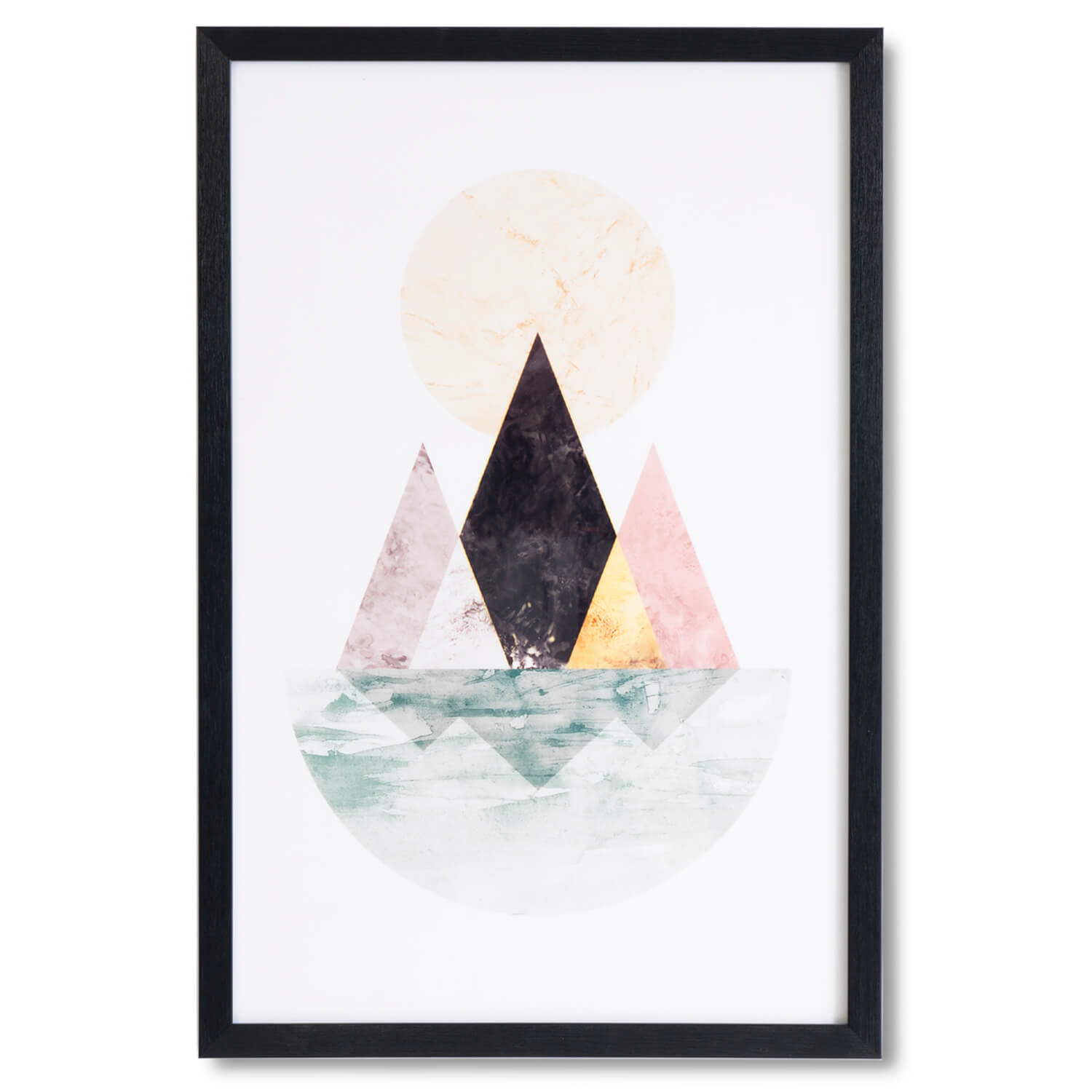 Denna målning presenterar en abstrakt komposition av geometriska former som påminner om berg och deras reflektion i sjön.