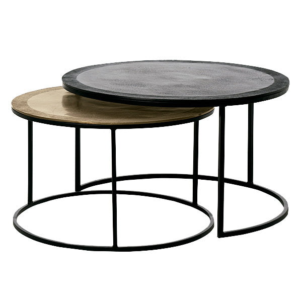 Set med 2 soffbord med minimalistisk stil Borden är gjorda av aluminium i guld och svart ton med en unik och innovativ design och en rundad finish som gör att de drar till sig uppmärksamhet var de än placeras.
