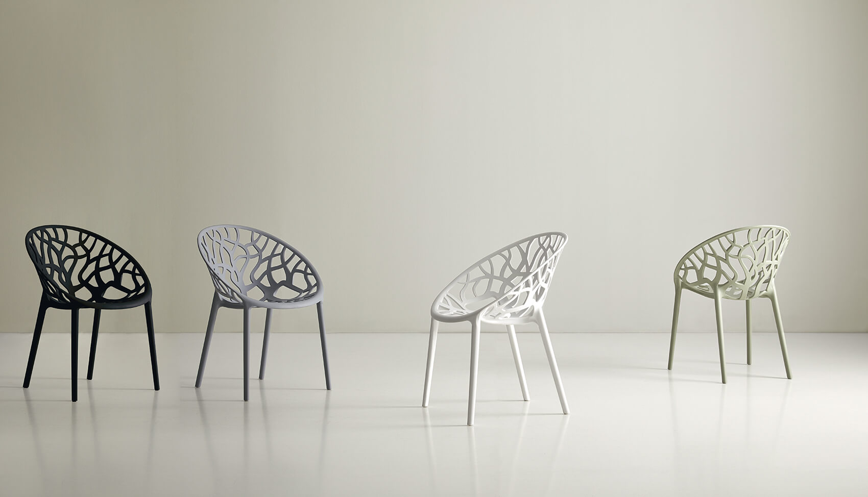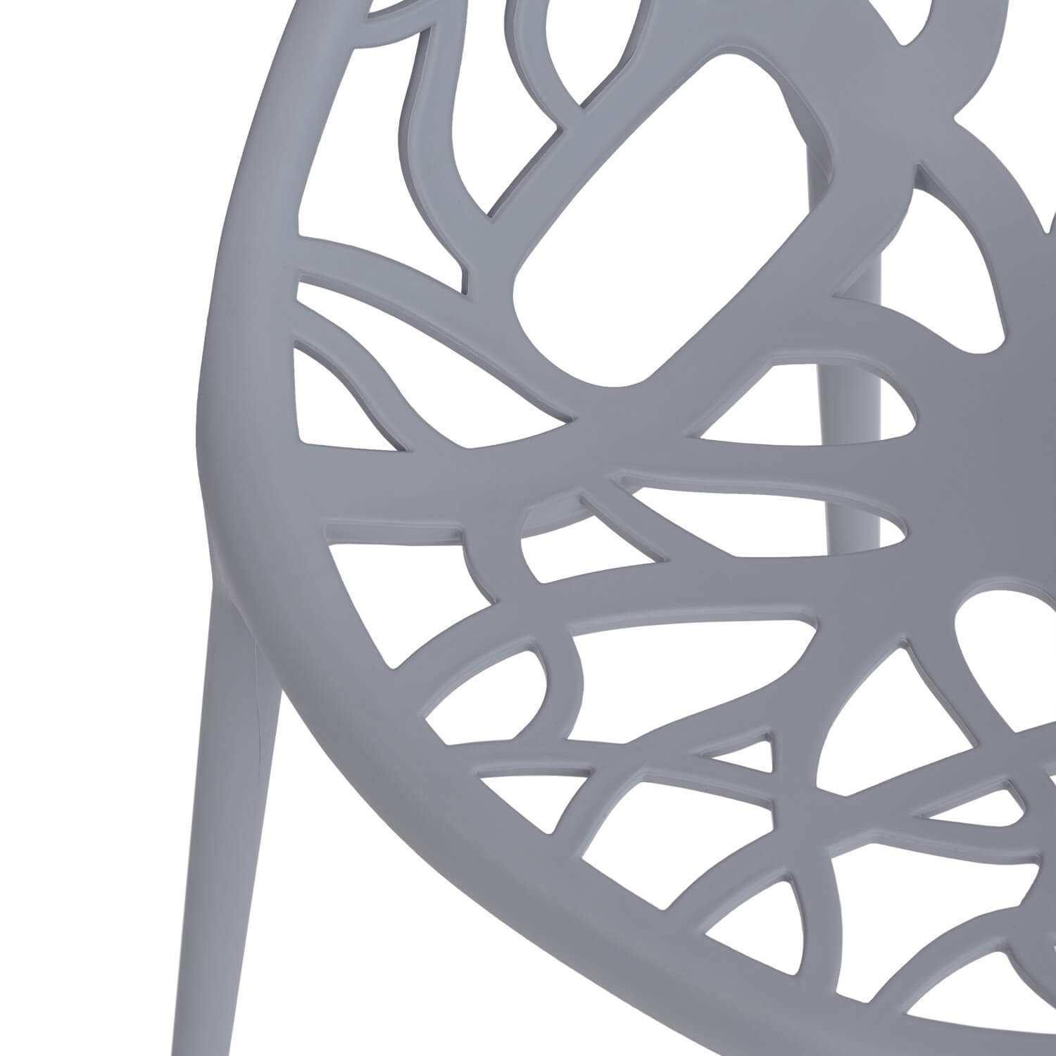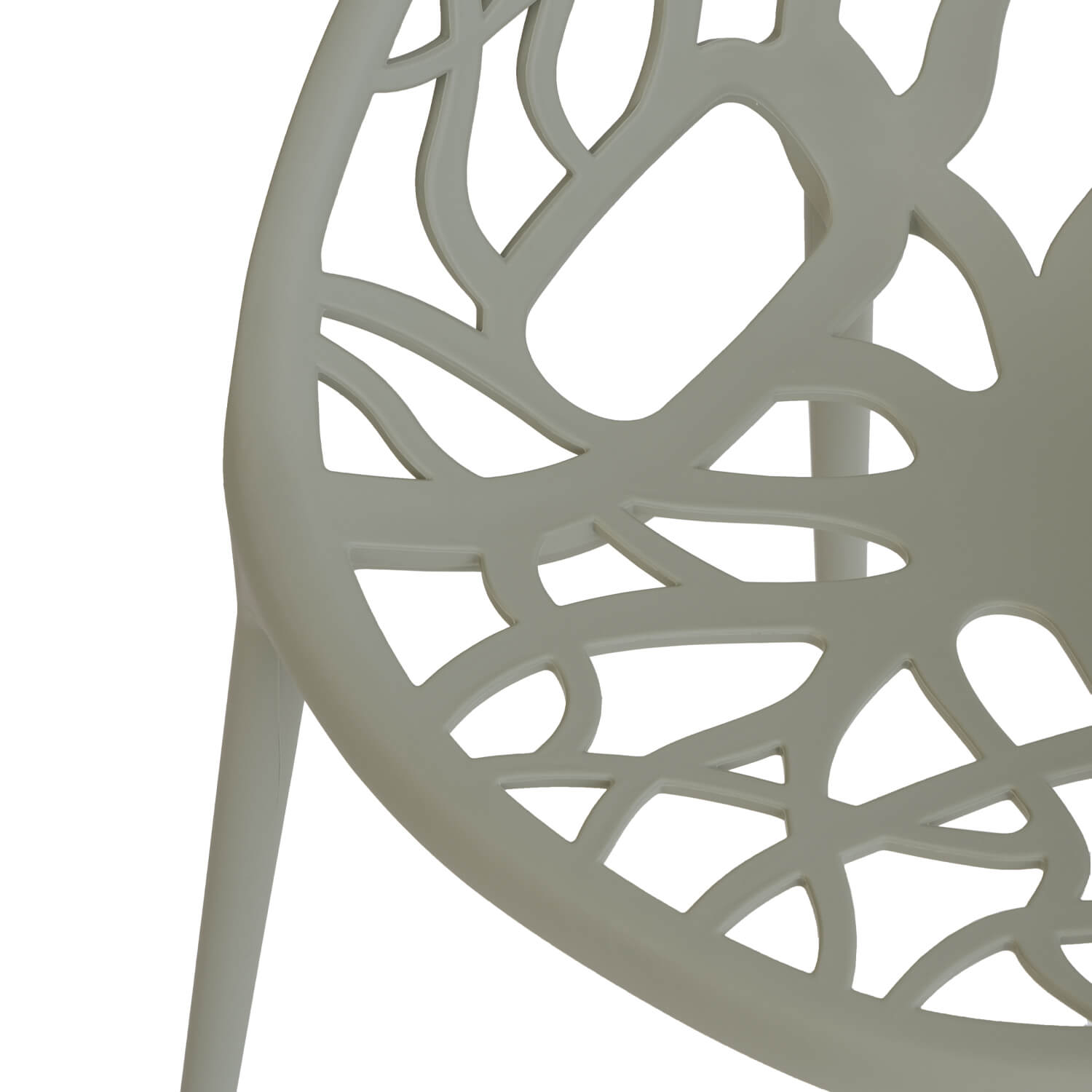Denna stol av polypropen sticker ut för sitt ryggstöd med ett intrikat mönster som efterliknar trädens förgrenade struktur, vilket skapar en attraktiv och naturlig visuell effekt.