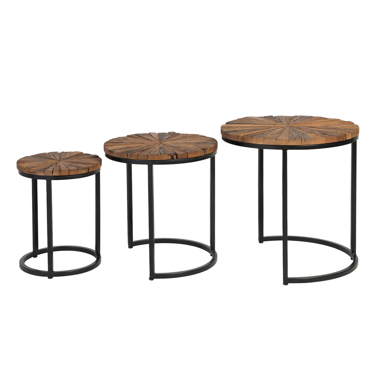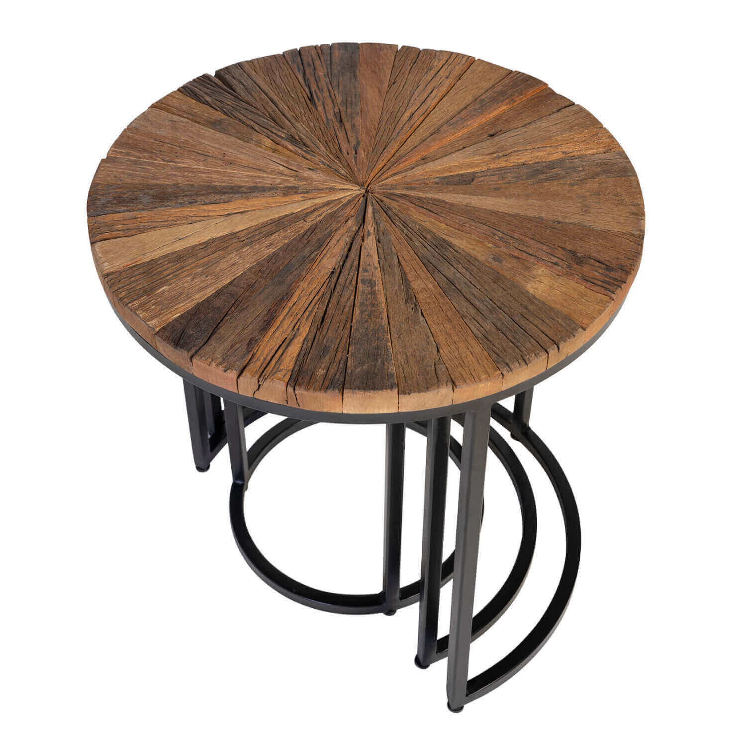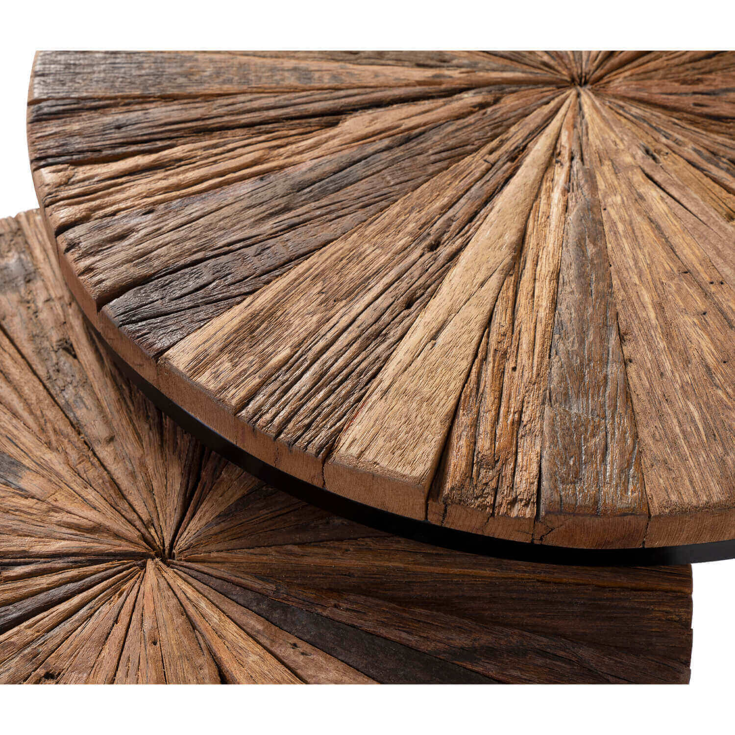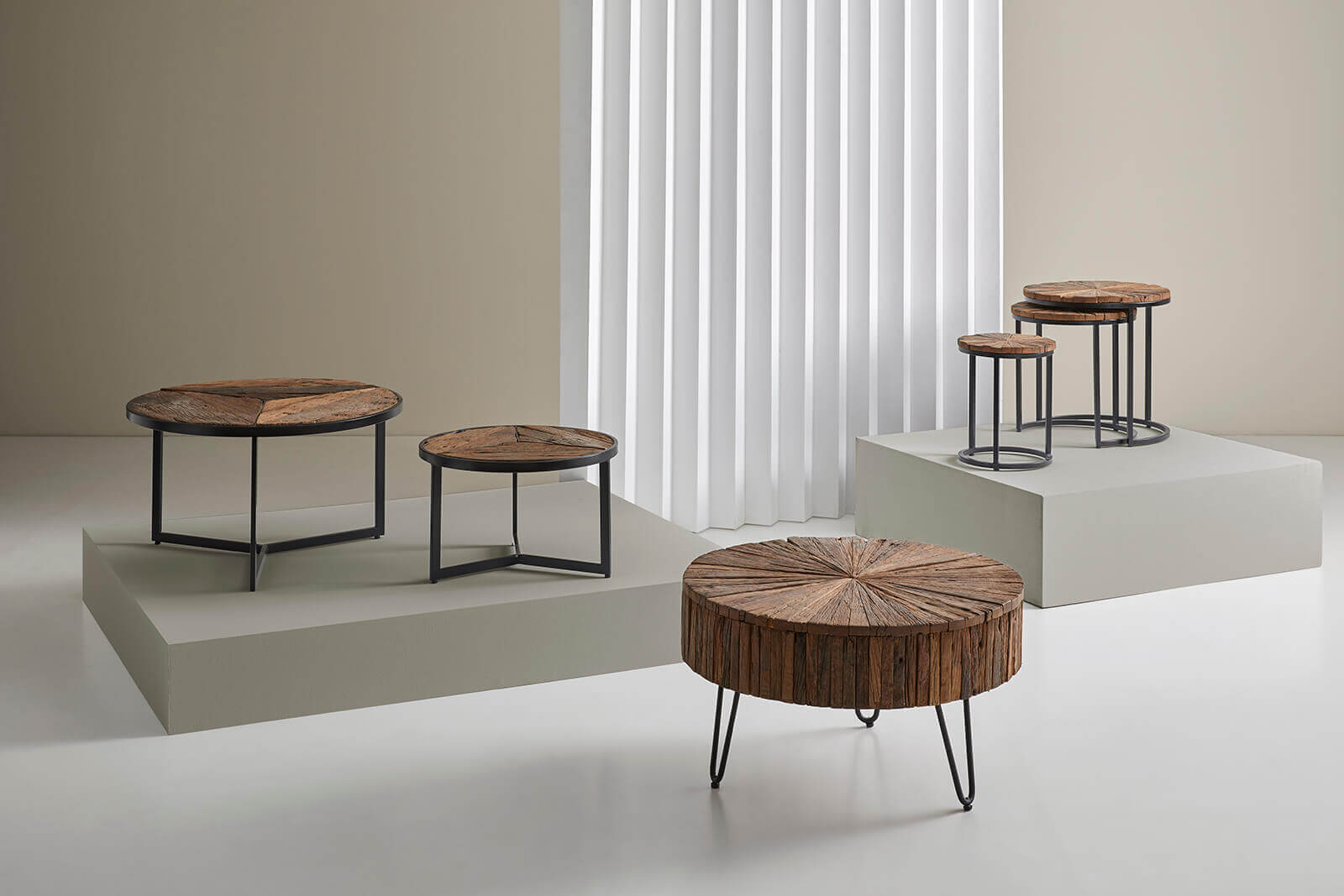 Varje bord har en cirkulär skiva av återvunnet trä, som framhäver träets naturliga skönhet och unika struktur. Benen, som är gjorda av mattsvart lackerat järn, ger en modern och elegant touch.