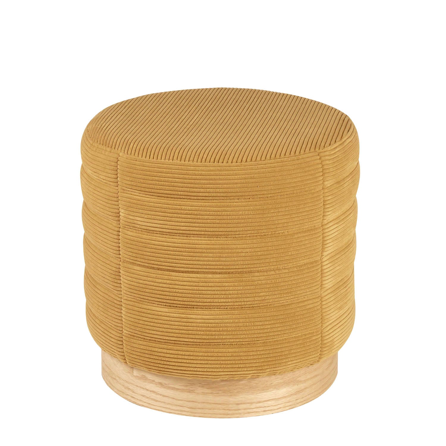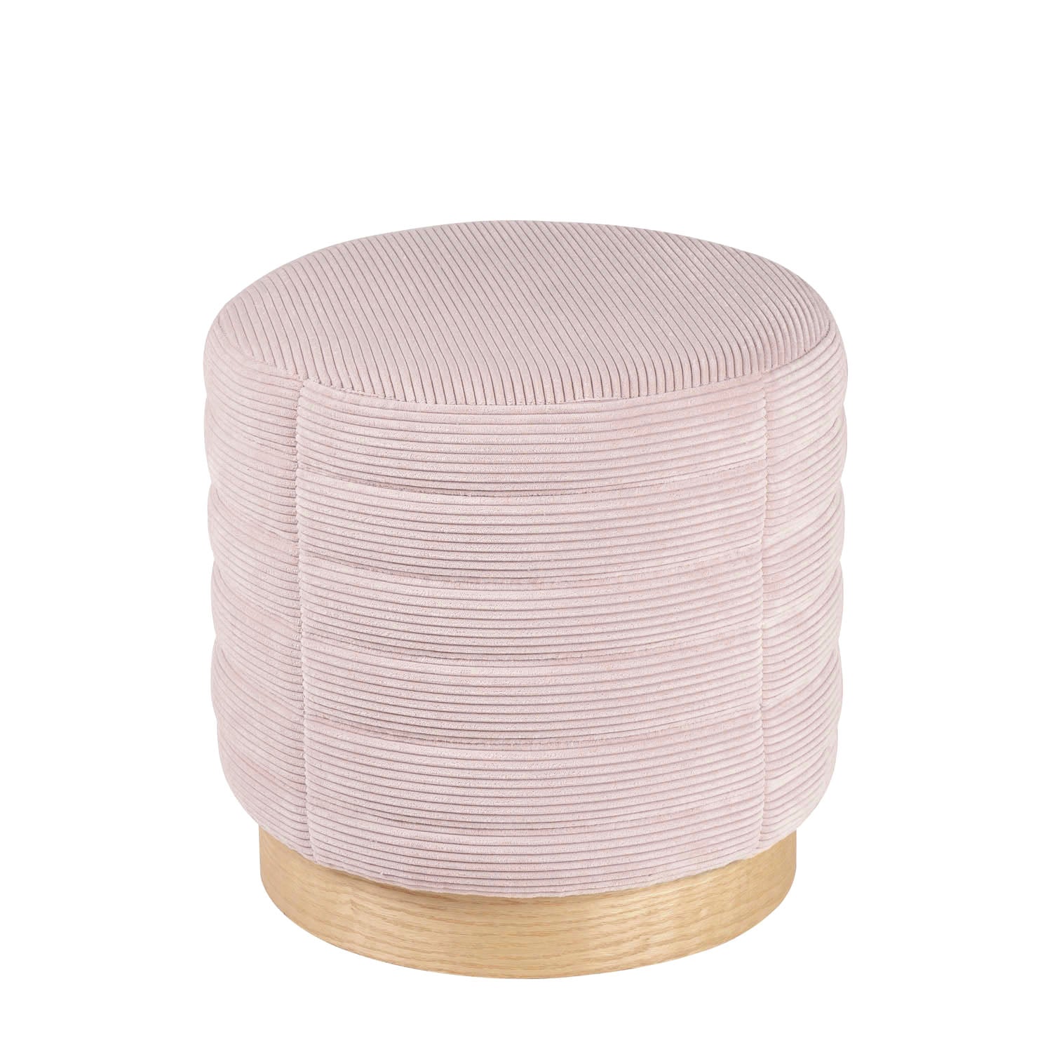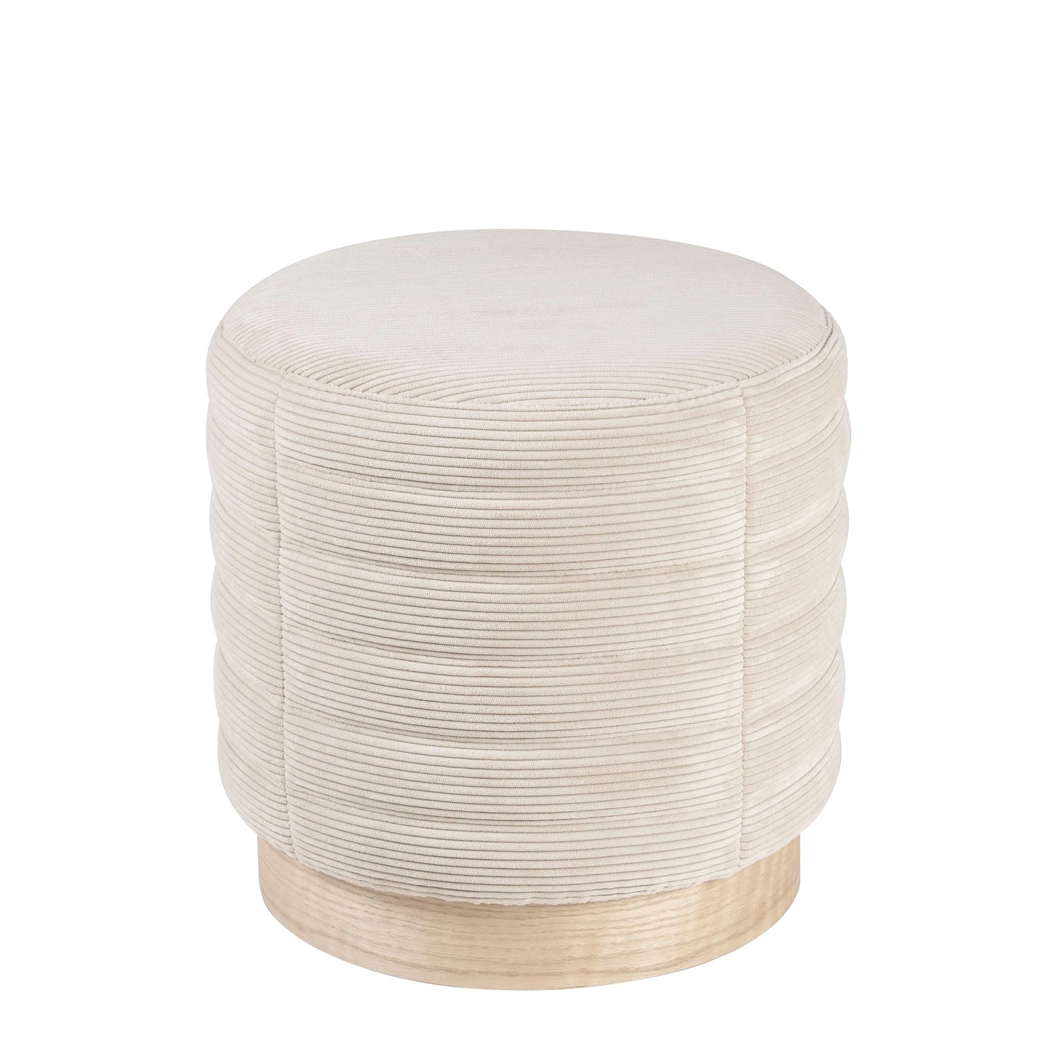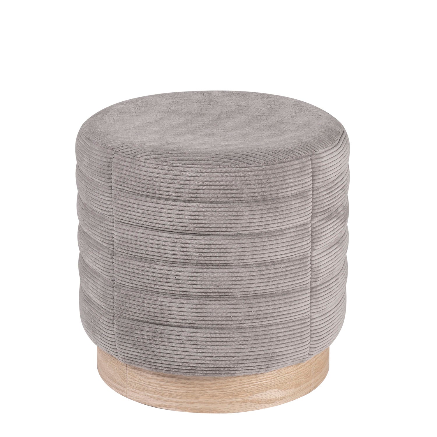 Rund puff med grårandigt tyg, sammetseffekt och träbotten.